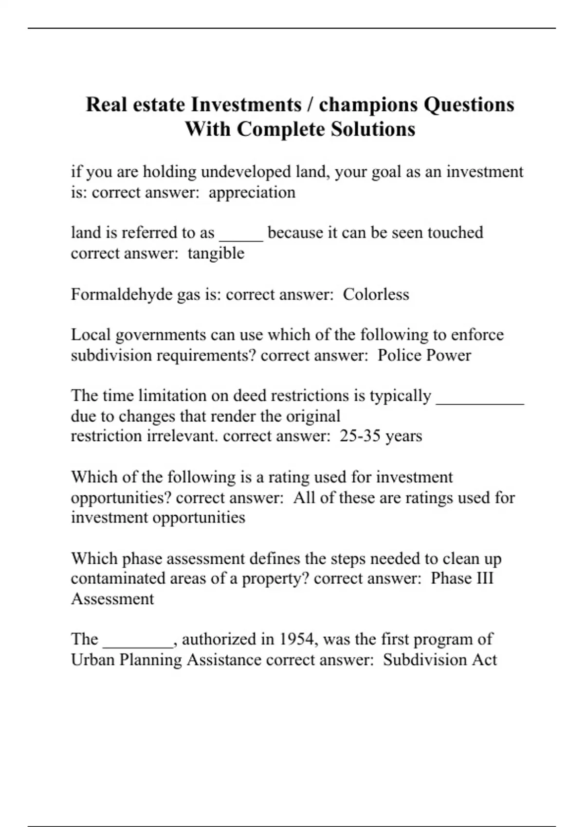 if you are holding undeveloped land, your goal as an investment is: correct answer: appreciation land is referred to as _____ because it can be seen touched correct answer: tangible Formaldehyde gas is: correct answer: Colorless Local governments can use which of the following to enforce subdivision requirements? correct answer: Police Power The time limitation on deed restrictions is typically __________ due to changes that render the original restriction irrelevant. correct answer: 25-35 years Which of the following is a rating used for investment opportunities? correct answer: All of these are ratings used for investment opportunities Which phase assessment defines the steps needed to clean up contaminated areas of a property? correct answer: Phase III Assessment The ________, authorized in 1954, was the first program of Urban Planning Assistance correct answer: Subdivision Act Which of the following are potentially responsible parties for clean-up costs of an environmental problem? correct answer: The party who transported the waste The right of ___________ includes the right to sell or mortgage property and the right to determine the duration of the ownership term. correct answer: Disposition