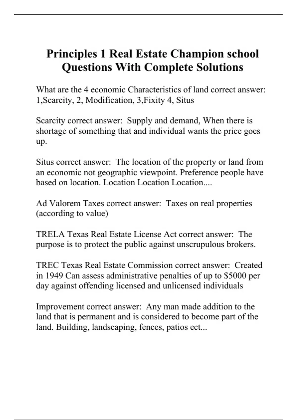 What are the 4 economic Characteristics of land correct answer: 1,Scarcity, 2, Modification, 3,Fixity 4, Situs Scarcity correct answer: Supply and demand, When there is shortage of something that and individual wants the price goes up. Situs correct answer: The location of the property or land from an economic not geographic viewpoint. Preference people have based on location. Location Location Location.... Ad Valorem Taxes correct answer: Taxes on real properties (according to value) TRELA Texas Real Estate License Act correct answer: The purpose is to protect the public against unscrupulous brokers. TREC Texas Real Estate Commission correct answer: Created in 1949 Can assess administrative penalties of up to $5000 per day against offending licensed and unlicensed individuals Improvement correct answer: Any man made addition to the land that is permanent and is considered to become part of the land. Building, landscaping, fences, patios ect... Fixture correct answer: Personal property that has become attached to the land in such a way as to become real property Severance correct answer: Removing fixtures by detaching them from real property or uninstalling them (should be removed prior to listing)..or 'does not convey' Intention of the Parties correct answer: When an item was installed .. most important test