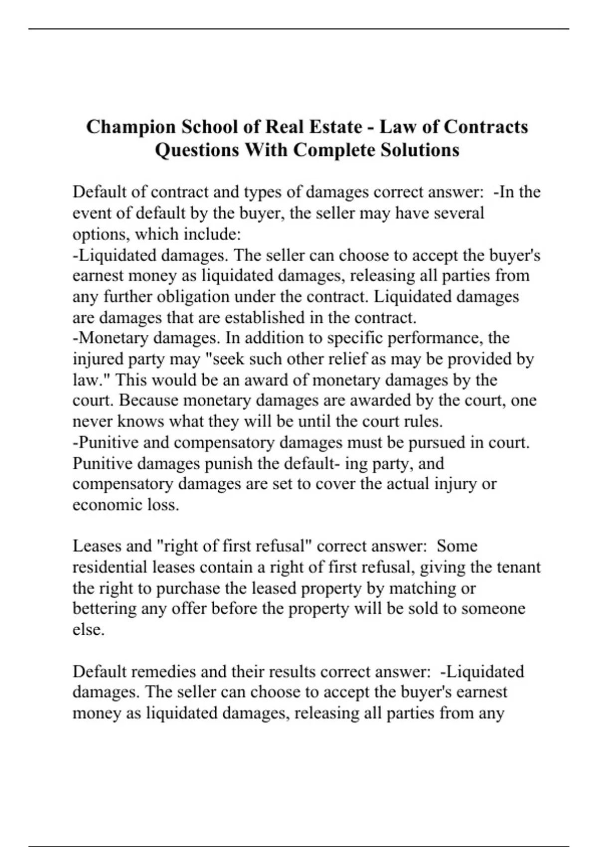 Default of contract and types of damages correct answer: -In the event of default by the buyer, the seller may have several options, which include: -Liquidated damages. The seller can choose to accept the buyer's earnest money as liquidated damages, releasing all parties from any further obligation under the contract. Liquidated damages are damages that are established in the contract. -Monetary damages. In addition to specific performance, the injured party may "seek such other relief as may be provided by law." This would be an award of monetary damages by the court. Because monetary damages are awarded by the court, one never knows what they will be until the court rules. -Punitive and compensatory damages must be pursued in court. Punitive damages punish the default- ing party, and compensatory damages are set to cover the actual injury or economic loss. Leases and "right of first refusal" correct answer: Some residential leases contain a right of first refusal, giving the tenant the right to purchase the leased property by matching or bettering any offer before the property will be sold to someone else. Default remedies and their results correct answer: -Liquidated damages. The seller can choose to accept the buyer's earnest money as liquidated damages, releasing all parties from any further obligation under the contract. Liquidated damages are damages that are established in the contract. -Monetary damages. In addition to specific performance, the injured party may "seek such other relief as may be provided by law." This would be an award of monetary damages by the court. Because monetary damages are awarded by the court, one never knows what they will be until the court rules. -Specific performance. The injured party files a court action seeking an order of the court directing the defaulting party to