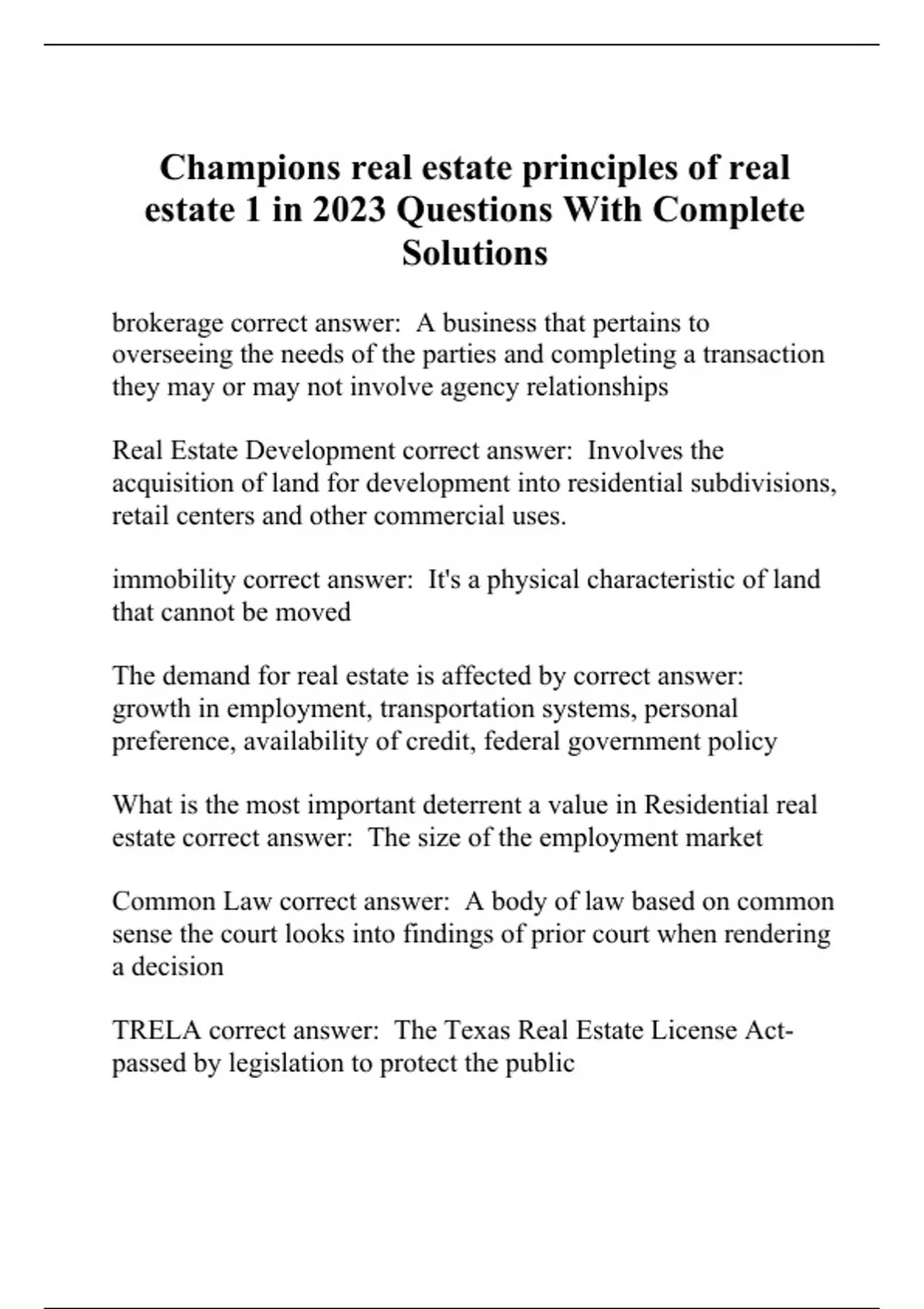 Champions real estate principles of real estate 1 in 2023 Questions With Complete Solutions