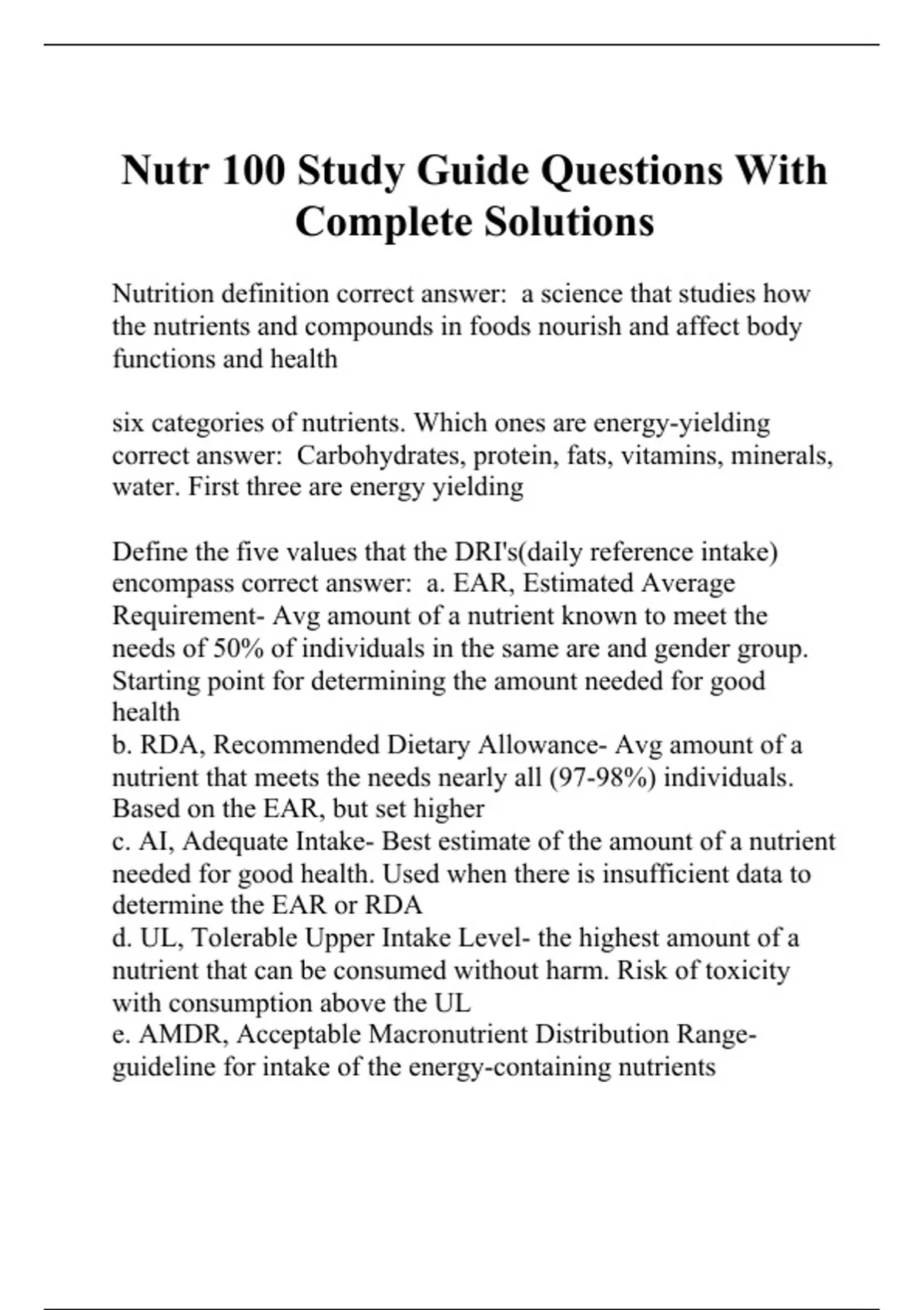 Nutr 100 Study Guide Questions With Complete Solutions