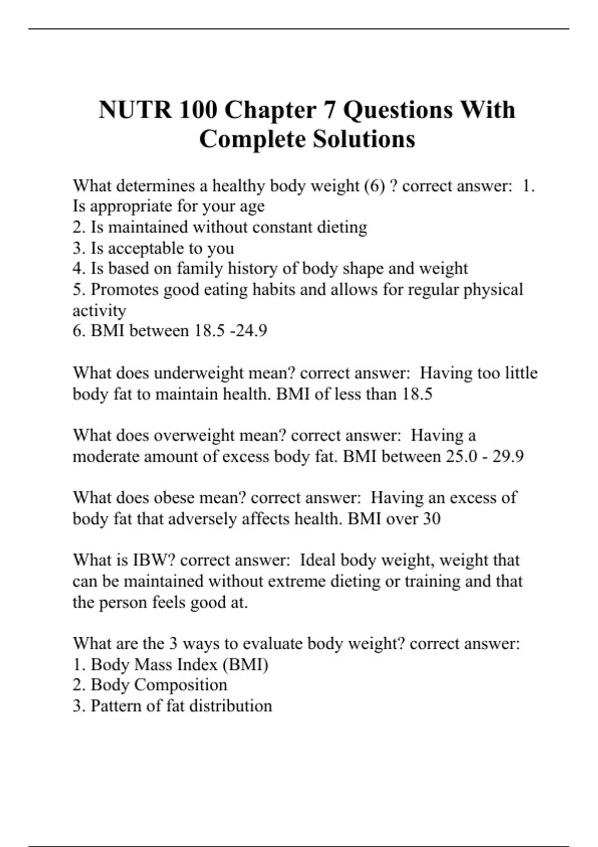 What determines a healthy body weight (6) ? correct answer: 1. Is appropriate for your age 2. Is maintained without constant dieting 3. Is acceptable to you 4. Is based on family history of body shape and weight 5. Promotes good eating habits and allows for regular physical activity 6. BMI between 18.5 -24.9 What does underweight mean? correct answer: Having too little body fat to maintain health. BMI of less than 18.5 What does overweight mean? correct answer: Having a moderate amount of excess body fat. BMI between 25.0 - 29.9 What does obese mean? correct answer: Having an excess of body fat that adversely affects health. BMI over 30 What is IBW? correct answer: Ideal body weight, weight that can be maintained without extreme dieting or training and that the person feels good at. What are the 3 ways to evaluate body weight? correct answer: 1. Body Mass Index (BMI) 2. Body Composition 3. Pattern of fat distribution What is BMI and how is it calculated? correct answer: Body mass index is a ratio that expresses a persons weight to the square of their height. BMI = weight (kg) / height (m)2 lbs to kg = /2.2 ft/inches to cm = x 2.52 What are the limitations of the BMI (4)? correct answer: Not appropriate for those who are high in muscle, under 18 (still growing), pregnant or breast feeding, or over the a