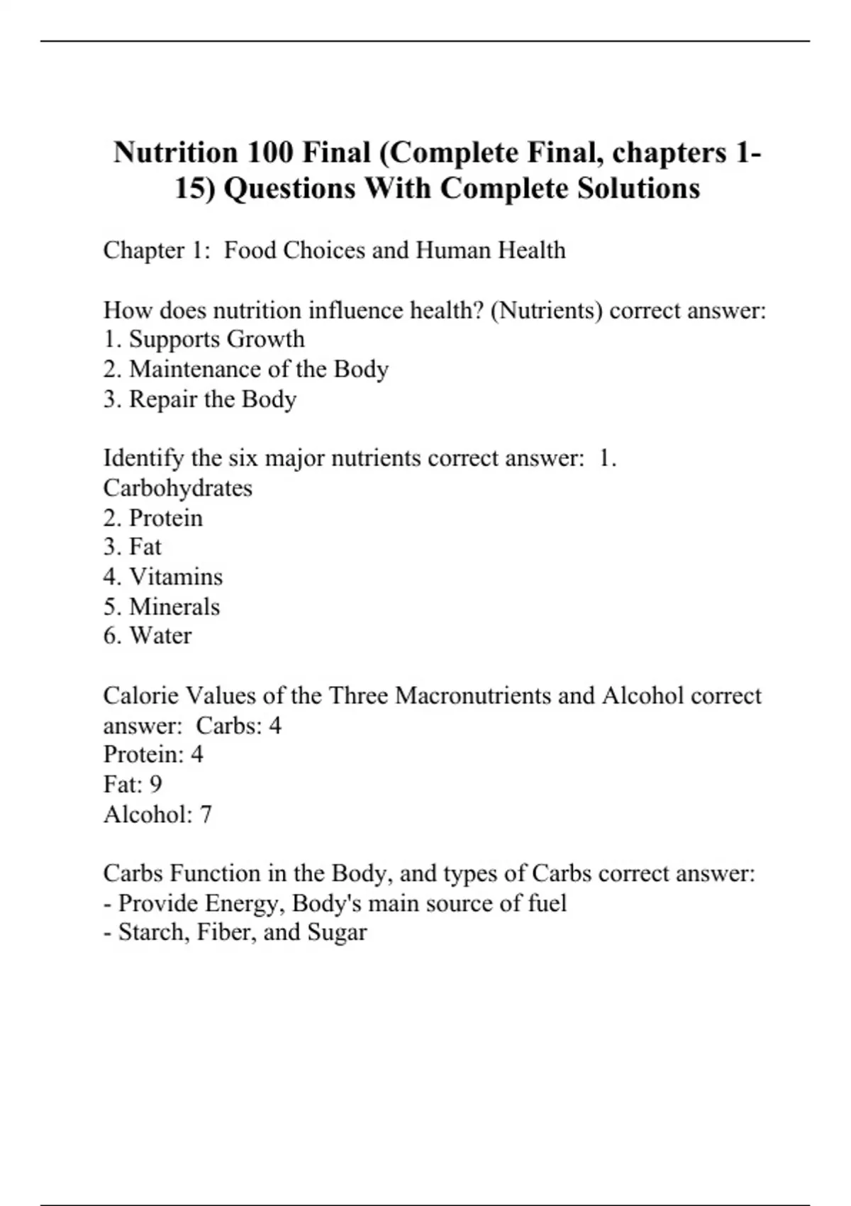 Chapter 1: Food Choices and Human Health How does nutrition influence health? (Nutrients) correct answer: 1. Supports Growth 2. Maintenance of the Body 3. Repair the Body Identify the six major nutrients correct answer: 1. Carbohydrates 2. Protein 3. Fat 4. Vitamins 5. Minerals 6. Water Calorie Values of the Three Macronutrients and Alcohol correct answer: Carbs: 4 Protein: 4 Fat: 9 Alcohol: 7 Carbs Function in the Body, and types of Carbs correct answer: - Provide Energy, Body's main source of fuel - Starch, Fiber, and Sugar Protein Functions and make-up correct answer: -Essential for Structure of Red Blood Cells -Assists in the proper functioning of antibodies for resisting infection -Can provide Energy -Built from Amino Acids Fat Functions and make-up correct answer: -Backup source of energy -Provides Heat -Made up of lipids Micronutrients and their functions correct answer: -Vitamins and Minerals - Act as regulators, work in all of the body's processes. Functions of Water correct answer: -Helps body cells function -Carries micronutrients to cells