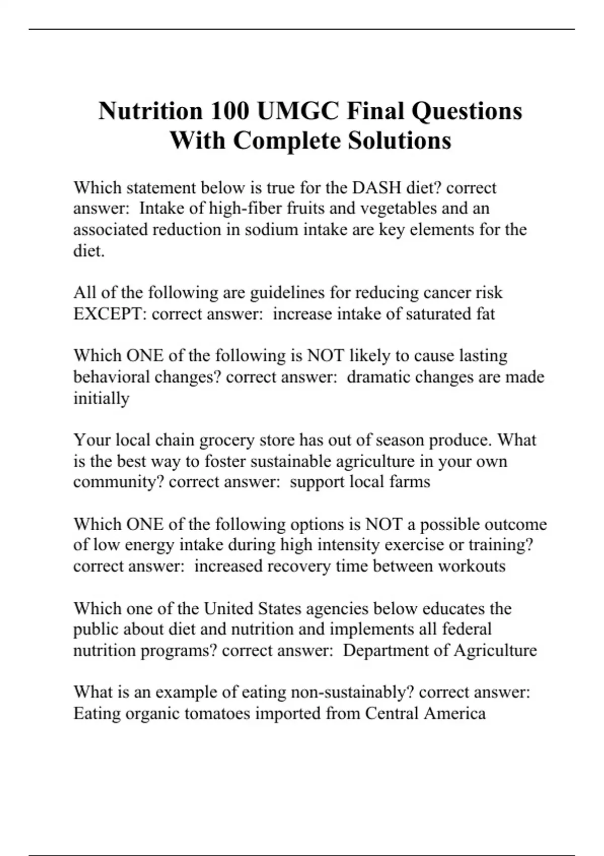 Nutrition 100 UMGC Final Questions With Complete Solutions