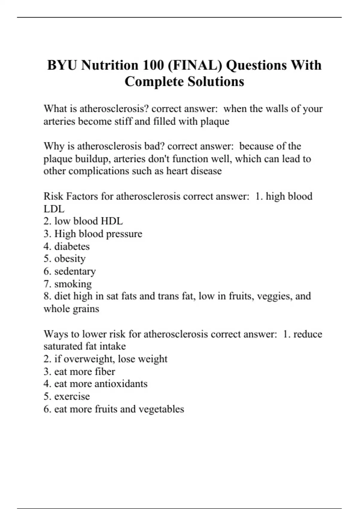 What is atherosclerosis? correct answer: when the walls of your arteries become stiff and filled with plaque Why is atherosclerosis bad? correct answer: because of the plaque buildup, arteries don't function well, which can lead to other complications such as heart disease Risk Factors for atherosclerosis correct answer: 1. high blood LDL 2. low blood HDL 3. High blood pressure 4. diabetes 5. obesity 6. sedentary 7. smoking 8. diet high in sat fats and trans fat, low in fruits, veggies, and whole grains Ways to lower risk for atherosclerosis correct answer: 1. reduce saturated fat intake 2. if overweight, lose weight 3. eat more fiber 4. eat more antioxidants 5. exercise 6. eat more fruits and vegetables What is hypertension? correct answer: high blood pressure What can be a cause of hypertension? correct answer: atherosclerosis What increases your risk of developing hypertension? correct answer: 1. sedentary lifestyle 2. overweight 3. sodium (controversial) 4. genetics What decreases your risk of developing hypertension? correct answer: 1. exercise 2. eat the DASH diet 3. genetics Why isn't decreasing cholesterol intake a good solution to hypertension? correct answer: Th