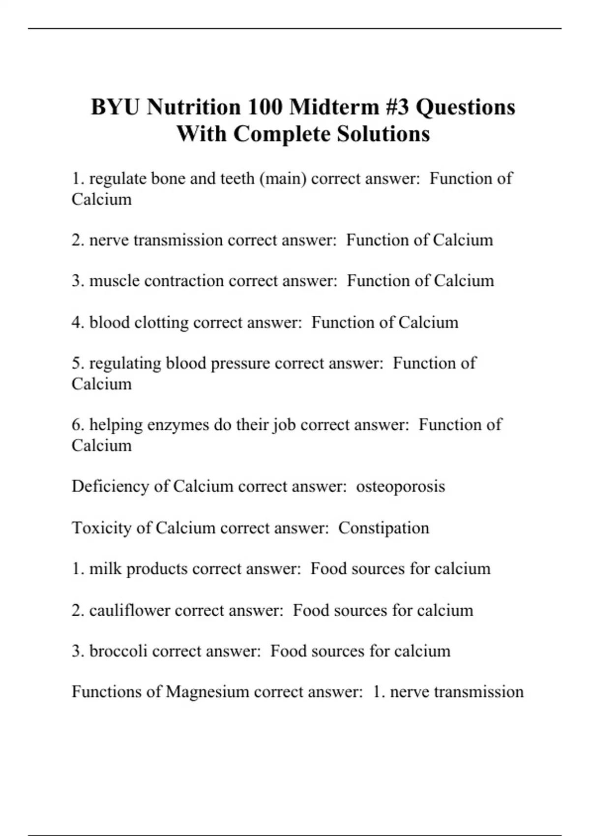 1. regulate bone and teeth (main) correct answer: Function of Calcium 2. nerve transmission correct answer: Function of Calcium 3. muscle contraction correct answer: Function of Calcium 4. blood clotting correct answer: Function of Calcium 5. regulating blood pressure correct answer: Function of Calcium 6. helping enzymes do their job correct answer: Function of Calcium Deficiency of Calcium correct answer: osteoporosis Toxicity of Calcium correct answer: Constipation 1. milk products correct answer: Food sources for calcium 2. cauliflower correct answer: Food sources for calcium 3. broccoli correct answer: Food sources for calcium Functions of Magnesium correct answer: 1. nerve transmission 2. bone mineralization Food sources of Magnesium correct answer: 1. nuts 2. legumes 3. whole grains 4. dark, leafy greens Functions of Sodium correct answer: 1. nerve transmission 2. fluid balance Toxicity of Sodium correct answer: HBP which can lead to