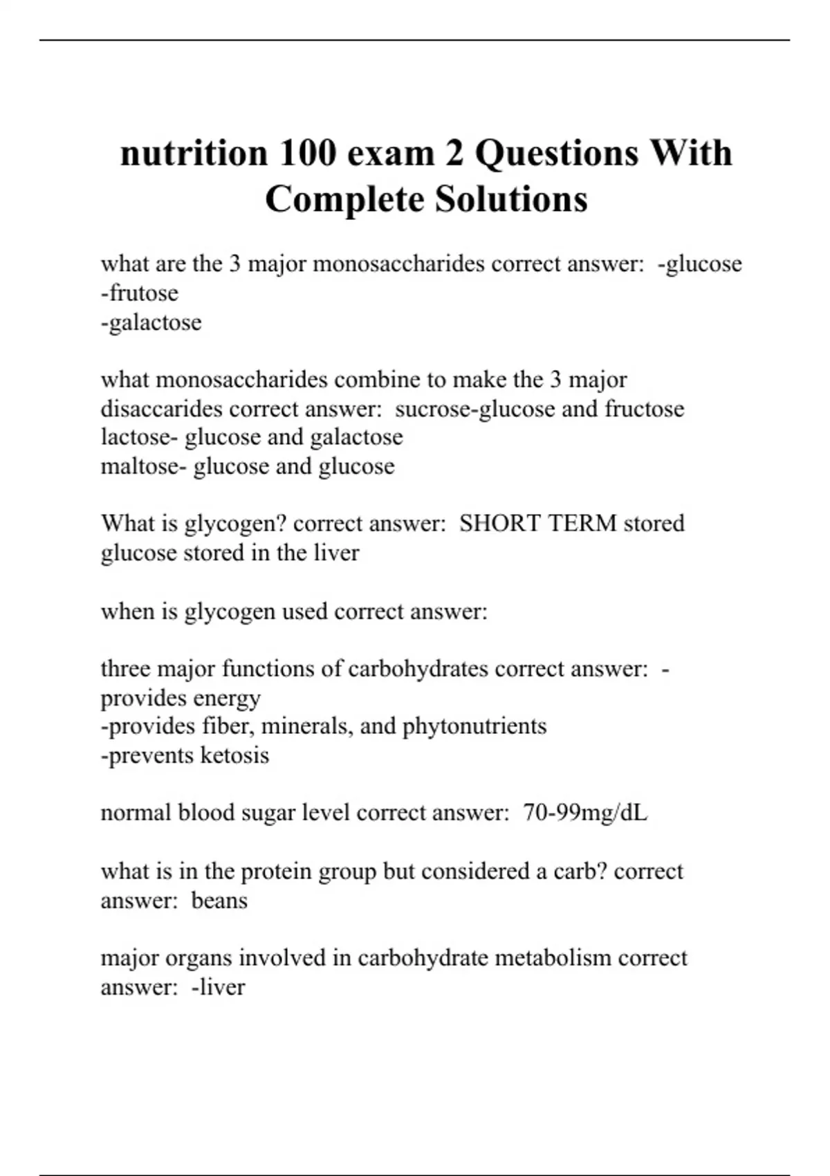 what are the 3 major monosaccharides correct answer: -glucose -frutose -galactose what monosaccharides combine to make the 3 major disaccarides correct answer: sucrose-glucose and fructose lactose- glucose and galactose maltose- glucose and glucose What is glycogen? correct answer: SHORT TERM stored glucose stored in the liver when is glycogen used correct answer: three major functions of carbohydrates correct answer: -provides energy -provides fiber, minerals, and phytonutrients -prevents ketosis normal blood sugar level correct answer: 70-99mg/dL what is in the protein group but considered a carb? correct answer: beans major organs involved in carbohydrate metabolism correct answer: -liver RDA for carbohydrates correct answer: 130 grams per day recommended calorie intake of carbs correct answer: 45-65% of total calories what is ketosis correct answer: inefficient breakdown of fat Where are monosaccharides absorbed? correct answer: small intestine Gluconeogenesis correct answer: formation of glucose from noncarbohydrate sources