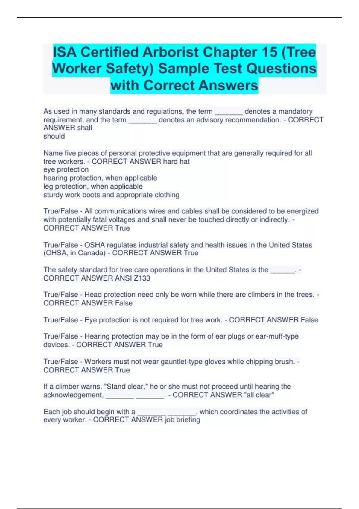 ISA Certified Arborist Chapter 15 (Tree Worker Safety) Sample Test Questions with Correct Answers As used in many standards and regulations, the term _______ denotes a mandatory requirement, and the term _______ denotes an advisory recommendation. - CORRECT ANSWER shall should Name five pieces of personal protective equipment that are generally required for all tree workers. - CORRECT ANSWER hard hat eye protection hearing protection, when applicable leg protection, when applicable sturdy work boots and appropriate clothing True/False - All communications wires and cables shall be considered to be energized with potentially fatal voltages and shall never be touched directly or indirectly. - CORRECT ANSWER True True/False - OSHA regulates industrial safety and health issues in the United States (OHSA, in Canada) - CORRECT ANSWER True The safety standard for tree care operations in the United States is the ______. - CORRECT ANSWER ANSI Z133