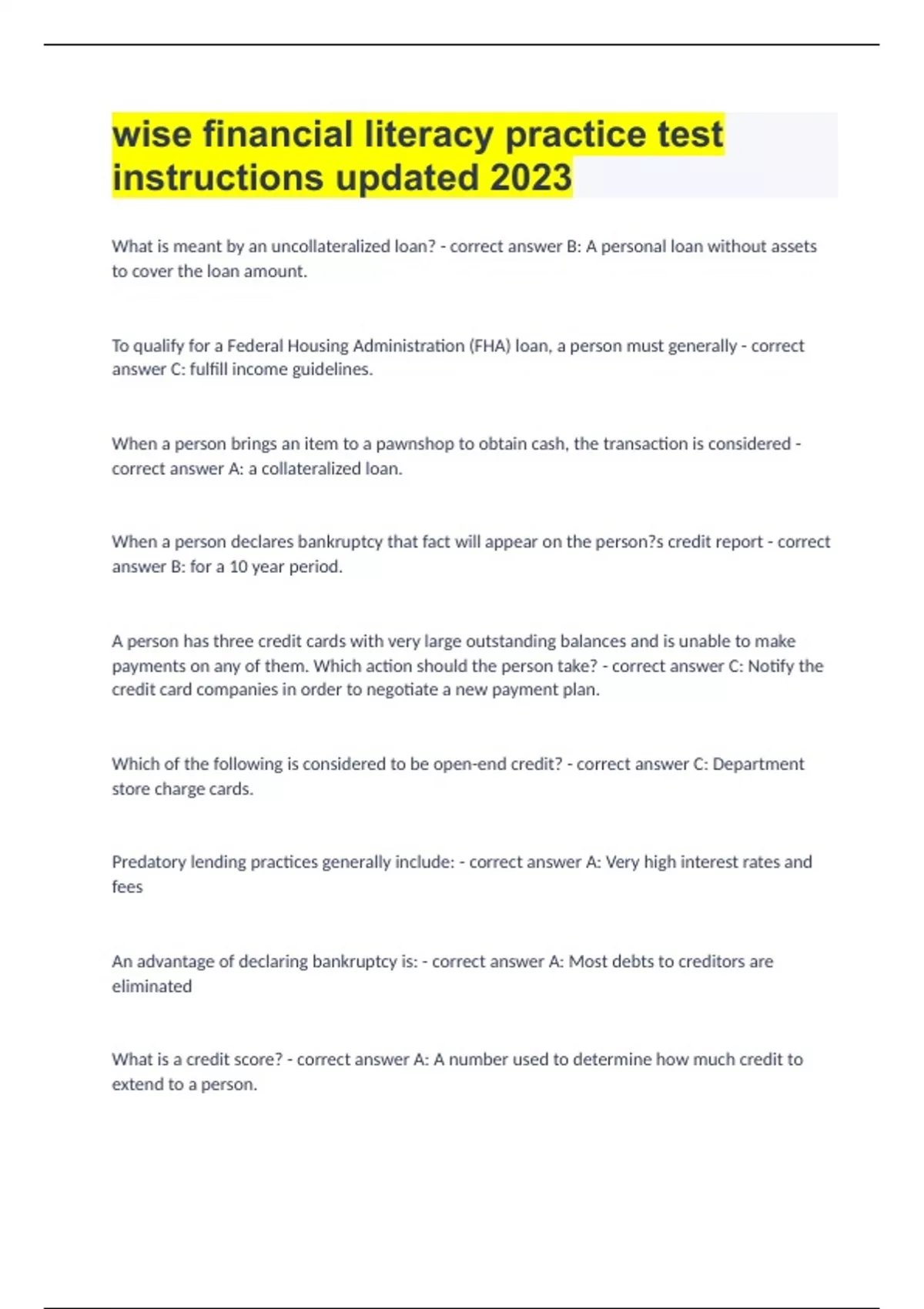wise financial literacy practice test instructions updated 2023/24