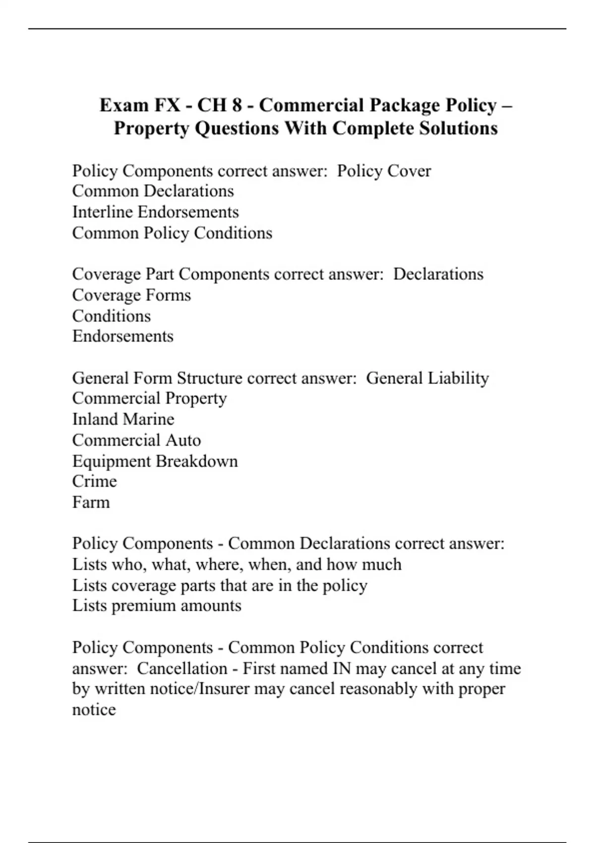 Policy Components correct answer: Policy Cover Common Declarations Interline Endorsements Common Policy Conditions Coverage Part Components correct answer: Declarations Coverage Forms Conditions Endorsements General Form Structure correct answer: General Liability Commercial Property Inland Marine Commercial Auto Equipment Breakdown Crime Farm Policy Components - Common Declarations correct answer: Lists who, what, where, when, and how much Lists coverage parts that are in the policy Lists premium amounts Policy Components - Common Policy Conditions correct answer: Cancellation - First named IN may cancel at any time by written notice/Insurer may cancel reasonably with proper notice Changes - Only made by endorsement, and by first named insured Examination of books & records - Insurer has rights to audit books & records of IN up to 3 years after end of policy Inspections & surveys - Insurer can, but doesn't have to inspect Premiums - Payment from first named IN Transfer of rights & duties - (assignment) can only be granted w/ written consent Policy Components - Interline Endorsements correct answer: Apply, or could apply, to more than one coverage. Designed to eliminate redundancy and minimize number of endorsements in the policy