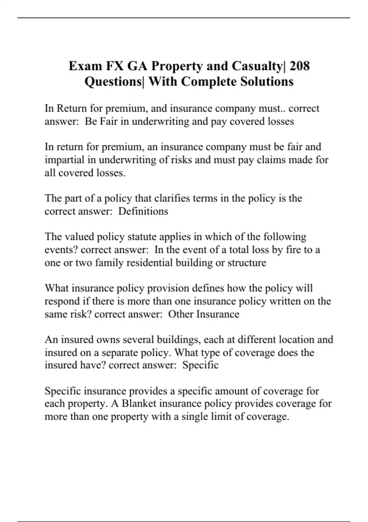 Exam FX GA Property and Casualty| 208 Questions| With Complete Solutions