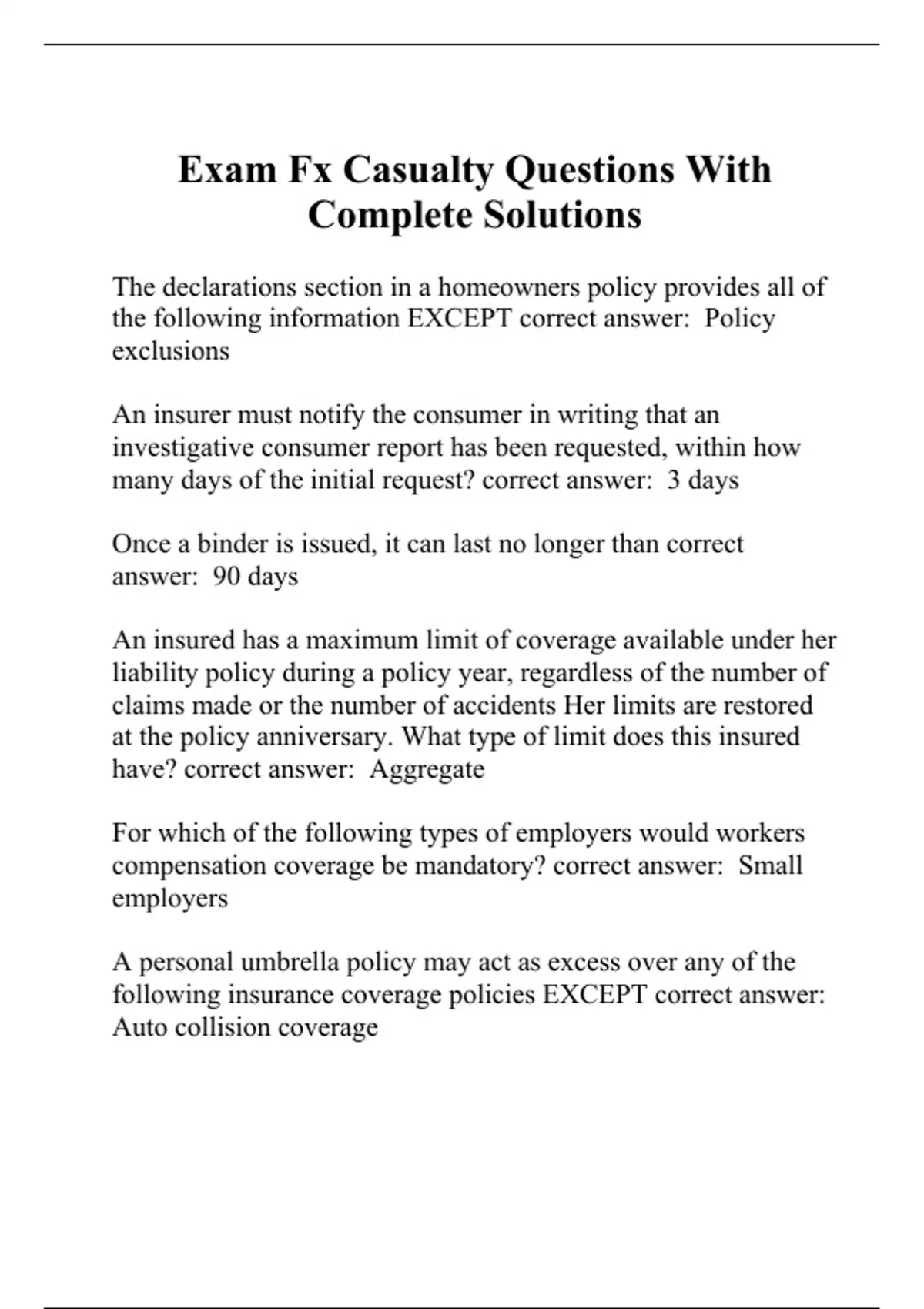 The declarations section in a homeowners policy provides all of the following information EXCEPT correct answer: Policy exclusions An insurer must notify the consumer in writing that an investigative consumer report has been requested, within how many days of the initial request? correct answer: 3 days Once a binder is issued, it can last no longer than correct answer: 90 days An insured has a maximum limit of coverage available under her liability policy during a policy year, regardless of the number of claims made or the number of accidents Her limits are restored at the policy anniversary. What type of limit does this insured have? correct answer: Aggregate For which of the following types of employers would workers compensation coverage be mandatory? correct answer: Small employers A personal umbrella policy may act as excess over any of the following insurance coverage policies EXCEPT correct answer: Auto collision coverage If an individual willfully violates provisions of the Fair Credit Reporting Act, what is the maximum civil penalty? correct answer: $2,500 All of the following are considerations in determining which state's law applies when a worker is required to travel into another state and is injured while working in the other state EXCEPT correct answer: The insurer's chartered location or domicile What types of injuries could incur additional penalties and/or increased benefits paid by the employer? correct answer: The employer's willful failure to provide required safety goggles Which of the following injuries may be covered under Coverage C- Medical Payments of a commercial general liability policy? correct answer: Injuries to a member of the general public that occurs on premises Within how many days must a licensee inform the Commissioner of any change in the licensee's address? correct answer: 30