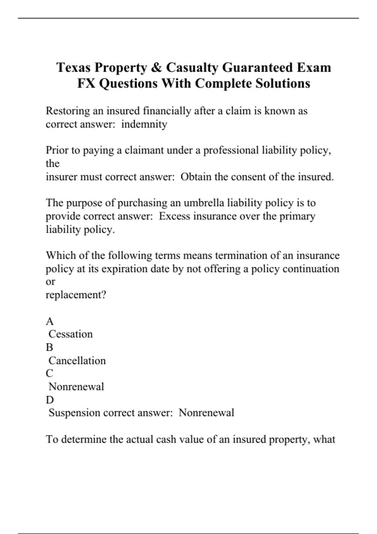 Restoring an insured financially after a claim is known as correct answer: indemnity Prior to paying a claimant under a professional liability policy, the insurer must correct answer: Obtain the consent of the insured. The purpose of purchasing an umbrella liability policy is to provide correct answer: Excess insurance over the primary liability policy. Which of the following terms means termination of an insurance policy at its expiration date by not offering a policy continuation or replacement? A Cessation B Cancellation C Nonrenewal D Suspension correct answer: Nonrenewal To determine the actual cash value of an insured property, what must be deducted from the current replacement cost? correct answer: Depreciated value All of the following are factors in the determination of actual cash value EXCEPT A . Insurance premium paid B Age of property. C Replacement cost. D. Property type. correct answer: Insurance premium paid Which type of damages is intended as a form of punishment for negligent, willful, or outrageous intent? correct answer: Punitive Which method of dealing with risk is applied when insurance is purchased? correct answer: to transfer