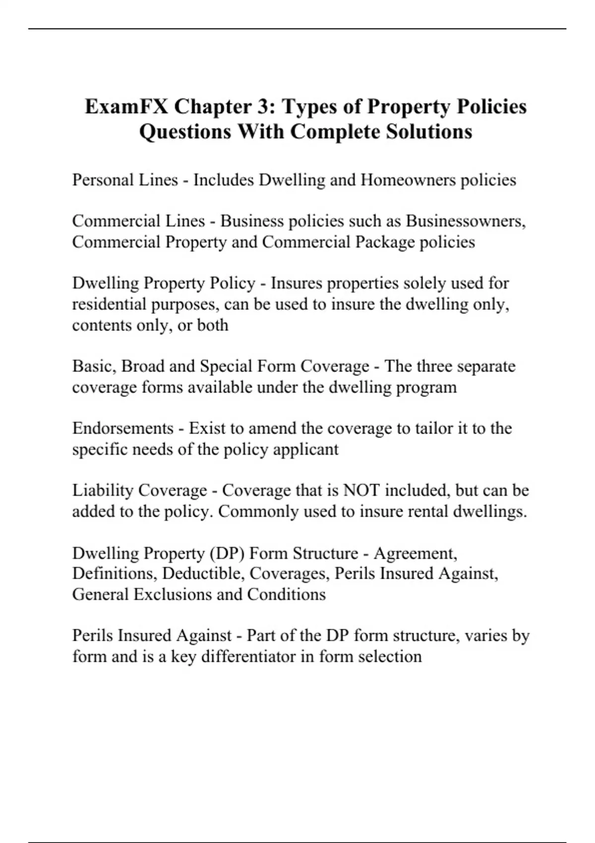 Dwelling Property (DP) Form Structure - Agreement, Definitions, Deductible, Coverages, Perils Insured Against, General Exclusions and Conditions
