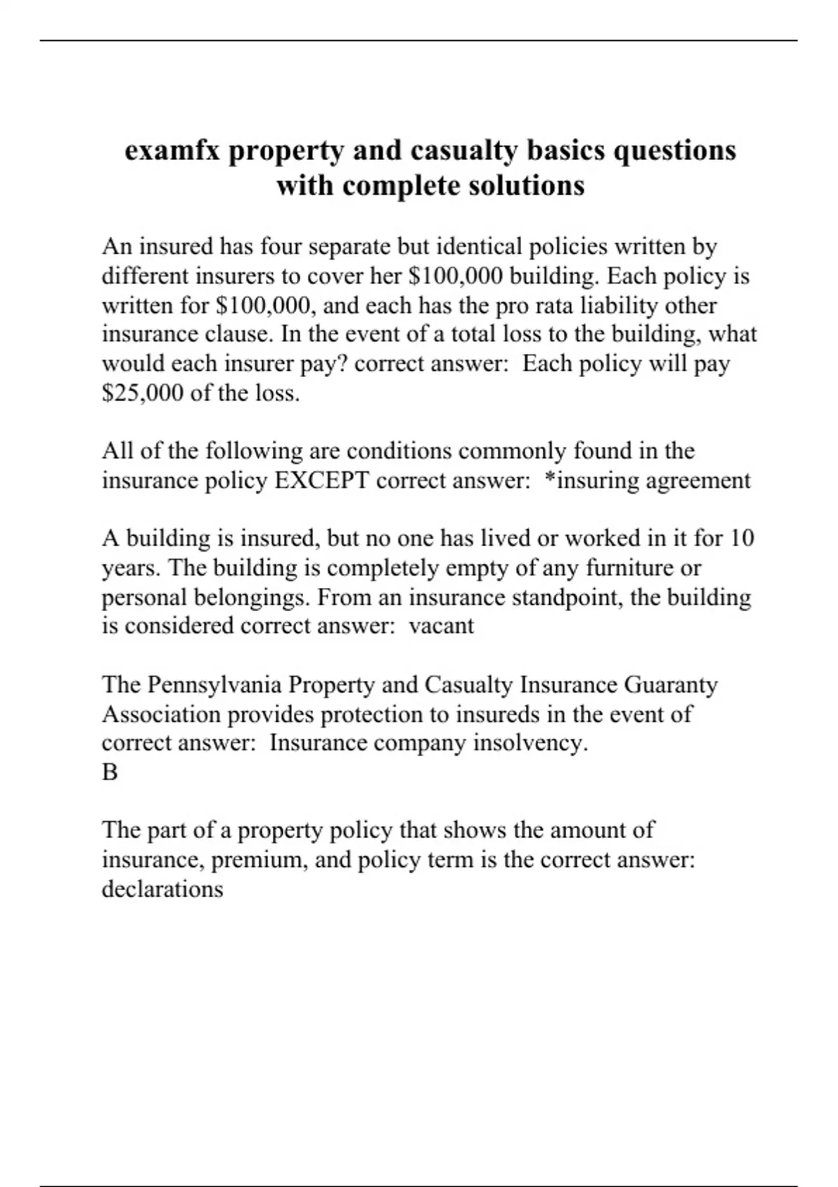 An insured has four separate but identical policies written by different insurers to cover her $100,000 building. Each policy is written for $100,000, and each has the pro rata liability other insurance clause. In the event of a total loss to the building, what would each insurer pay? correct answer: Each policy will pay $25,000 of the loss. All of the following are conditions commonly found in the insurance policy EXCEPT correct answer: *insuring agreement A building is insured, but no one has lived or worked in it for 10 years. The building is completely empty of any furniture or personal belongings. From an insurance standpoint, the building is considered correct answer: vacant The Pennsylvania Property and Casualty Insurance Guaranty Association provides protection to insureds in the event of correct answer: Insurance company insolvency. B The part of a property policy that shows the amount of insurance, premium, and policy term is the correct answer: declarations Property insurance that provides $100,000 coverage for a building and $50,000 coverage for personal property at a single location is called correct answer: specific A deli owner has a businessowners liability policy. When a customer slipped and hurt herself at the deli, the liability policy paid for medical expenses. The customer, however, is now suing the business owner because she claims there was no caution sign warning her that the floor was wet. What is the insurer obligated to do? correct answer: Pay to defend the policyowner in the lawsuit because liability coverage contains a duty-to-defend provision Which of the following is defined as the cost to replace damaged property with less expensive and more modern construction or equipment? correct answer: Functional replacement cost According to the standard mortgage clause, who has the right to bring a suit in their own name to recover damages, pay policy premiums, and submit a proof of loss? correct answer: Mortgagee Under contributory negligence, when an individual is found to have contributed to his or her own loss in any way, another party