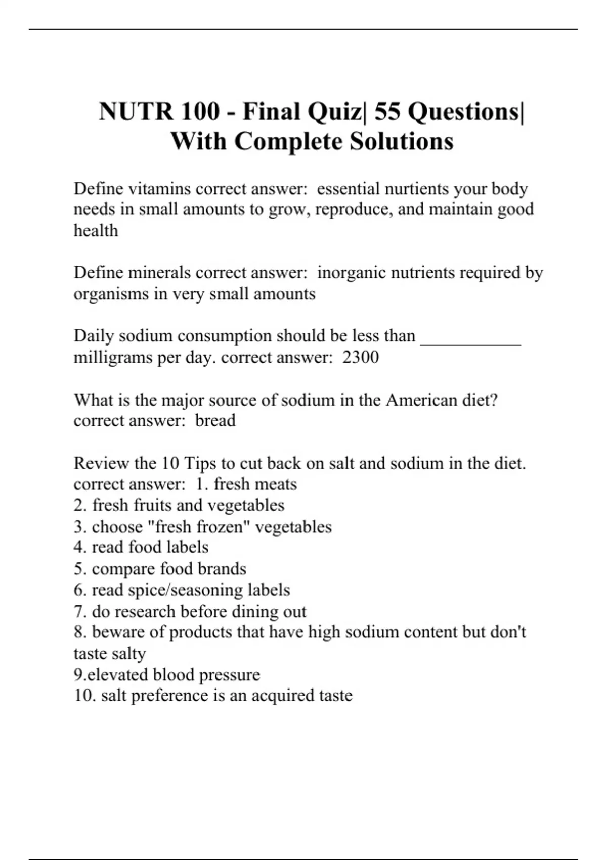 NUTR 100 - Final Quiz| 55 Questions| With Complete Solutions