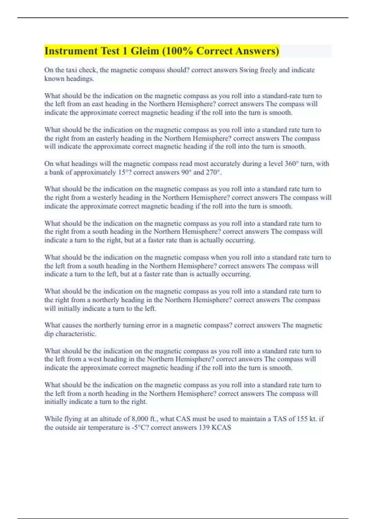 On the taxi check, the magnetic compass should? correct answers Swing freely and indicate known headings. What should be the indication on the magnetic compass as you roll into a standard-rate turn to the left from an east heading in the Northern Hemisphere? correct answers The compass will indicate the approximate correct magnetic heading if the roll into the turn is smooth. What should be the indication on the magnetic compass as you roll into a standard rate turn to the right from an easterly heading in the Northern Hemisphere? correct answers The compass will indicate the approximate correct magnetic heading if the roll into the turn is smooth. On what headings will the magnetic compass read most accurately during a level 360° turn, with a bank of approximately 15°? correct answers 90° and 270°. What should be the indication on the magnetic compass as you roll into a standard rate turn to the right from a westerly heading in the Northern Hemisphere? correct answers The compass will indicate the approximate correct magnetic heading if the roll into the turn is smooth. What should be the indication on the magnetic compass as you roll into a standard rate turn to the right from a south heading in the Northern Hemisphere? correct answers The compass will indicate a turn to the right, but at a faster rate than is actually occurring. What should be the indication on the magnetic compass when you roll into a standard rate turn to the left from a south heading in the Northern Hemisphere? correct answers The compass will indicate a turn to the left, but at a faster rate than is actually occurring. What should be the indication on the magnetic compass as you roll into a standard rate turn to the right from a northerly heading in the Northern Hemisphere? correct answers The compass will initially indicate a turn to the left. What causes the northerly turning error in a magnetic compass? correct answers The magnetic dip characteristic. What should be the indication on the magnetic compass as you roll into a standard rate turn to the left from a west heading in the Northern Hemisphere? correct answers The compass will indicate the approximate correct magnetic heading if the roll into the turn is smooth. What should be the indication on the magnetic compass as you roll into a standard rate turn to the left from a north heading in the Northern Hemisphere? correct answers The compass will initially indicate a turn to the right. While flying at an altitude of 8,000 ft., what CAS must be used to maintain a TAS of 155 kt. if the outside air temperature is -5°C? correct answers 139 KCAS