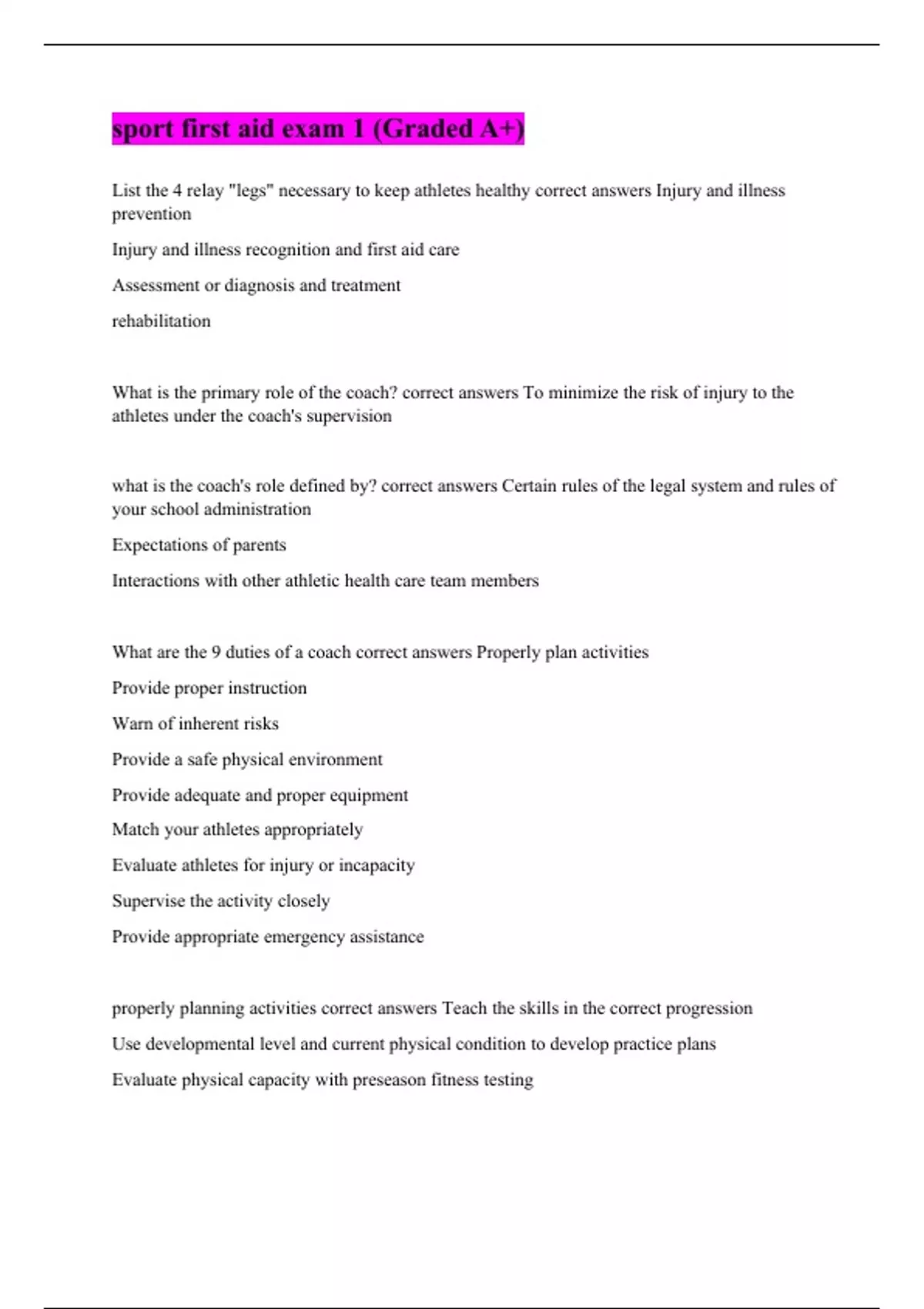 List the 4 relay "legs" necessary to keep athletes healthy correct answers Injury and illness prevention Injury and illness recognition and first aid care Assessment or diagnosis and treatment rehabilitation What is the primary role of the coach? correct answers To minimize the risk of injury to the athletes under the coach's supervision what is the coach's role defined by? correct answers Certain rules of the legal system and rules of your school administration Expectations of parents Interactions with other athletic health care team members What are the 9 duties of a coach correct answers Properly plan activities Provide proper instruction Warn of inherent risks Provide a safe physical environment Provide adequate and proper equipment Match your athletes appropriately Evaluate athletes for injury or incapacity Supervise the activity closely Provide appropriate emergency assistance properly planning activities correct answers Teach the skills in the correct progression Use developmental level and current physical condition to develop practice plans Evaluate physical capacity with preseason fitness testing