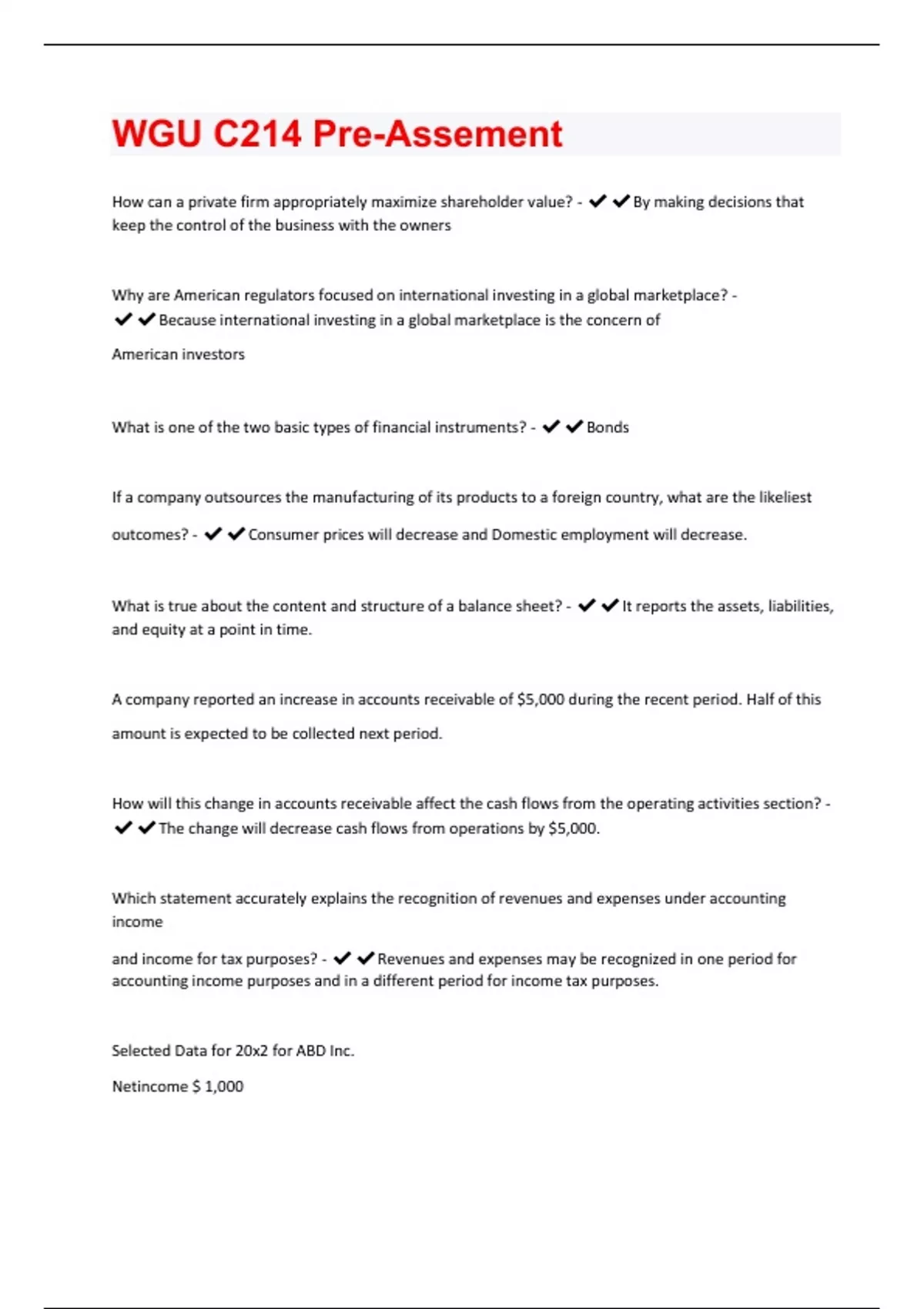 How can a private firm appropriately maximize shareholder value? - By making decisions that keep the control of the business with the owners Why are American regulators focused on international investing in a global marketplace? - Because international investing in a global marketplace is the concern of American investors What is one of the two basic types of financial instruments? - Bonds If a company outsources the manufacturing of its products to a foreign country, what are the likeliest outcomes? - Consumer prices will decrease and Domestic employment will decrease. What is true about the content and structure of a balance sheet? - It reports the assets, liabilities, and equity at a point in time. A company reported an increase in accounts receivable of $5,000 during the recent period. Half of this amount is expected to be collected next period. How will this change in accounts receivable affect the cash flows from the operating activities section? - The change will decrease cash flows from operations by $5,000. Which statement accurately explains the recognition of revenues and expenses under accounting income and income for tax purposes? - Revenues and expenses may be recognized in one period for accounting income purposes and in a different period for income tax purposes. Selected Data for 20x2 for ABD Inc. Netincome $ 1,000Depreciation expense $ 300 Change in operating assets $ 600 Change in net property, plant, and equipment$ 5,000 Changes in long-term liabilities $ 1,000 Dividends paid $ 200 What is the firm's cash flow from investments, using the data above and assuming no asset disposals? - $5,300 outflow