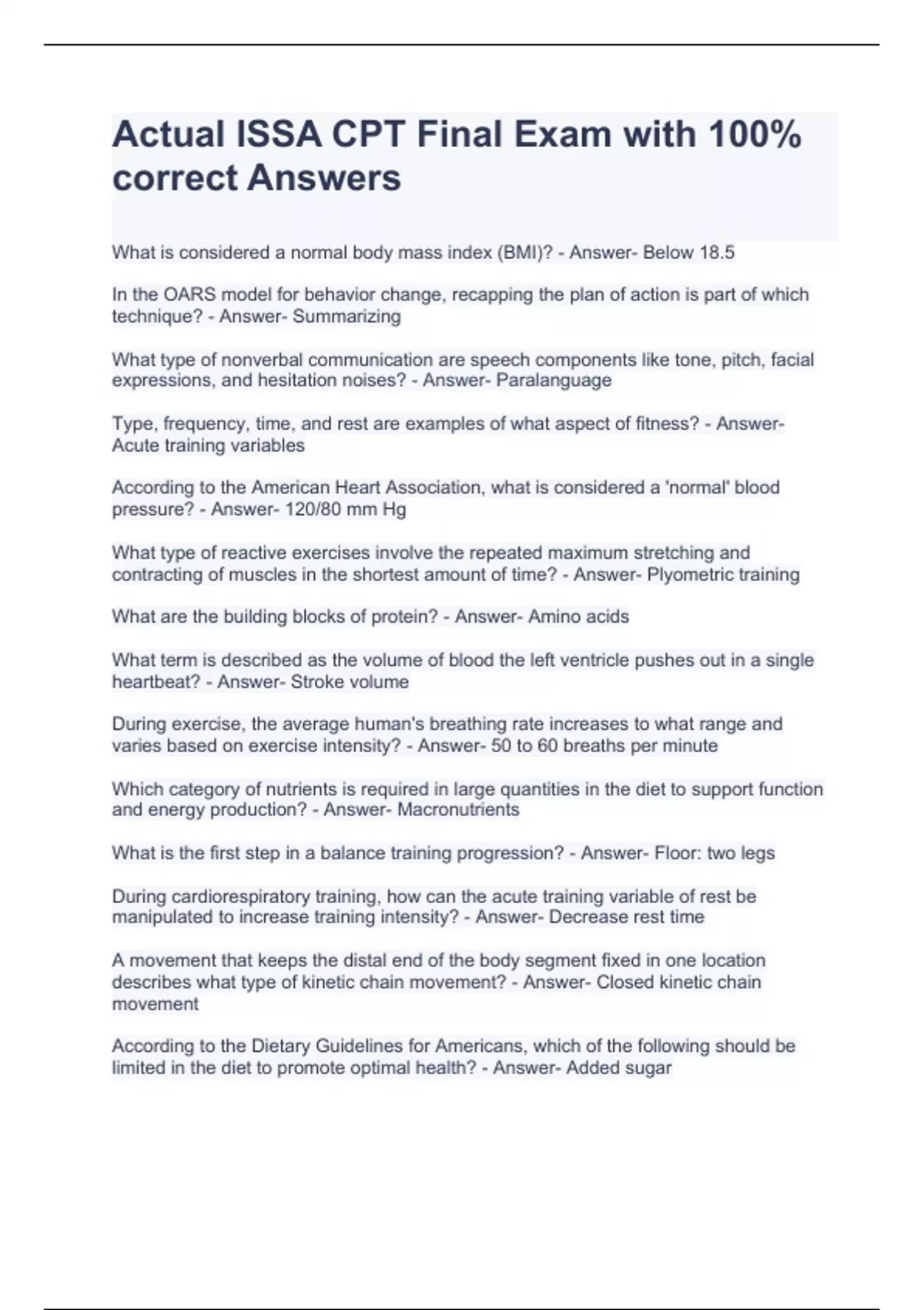 Actual ISSA CPT Final Exam with 100% correct Answers