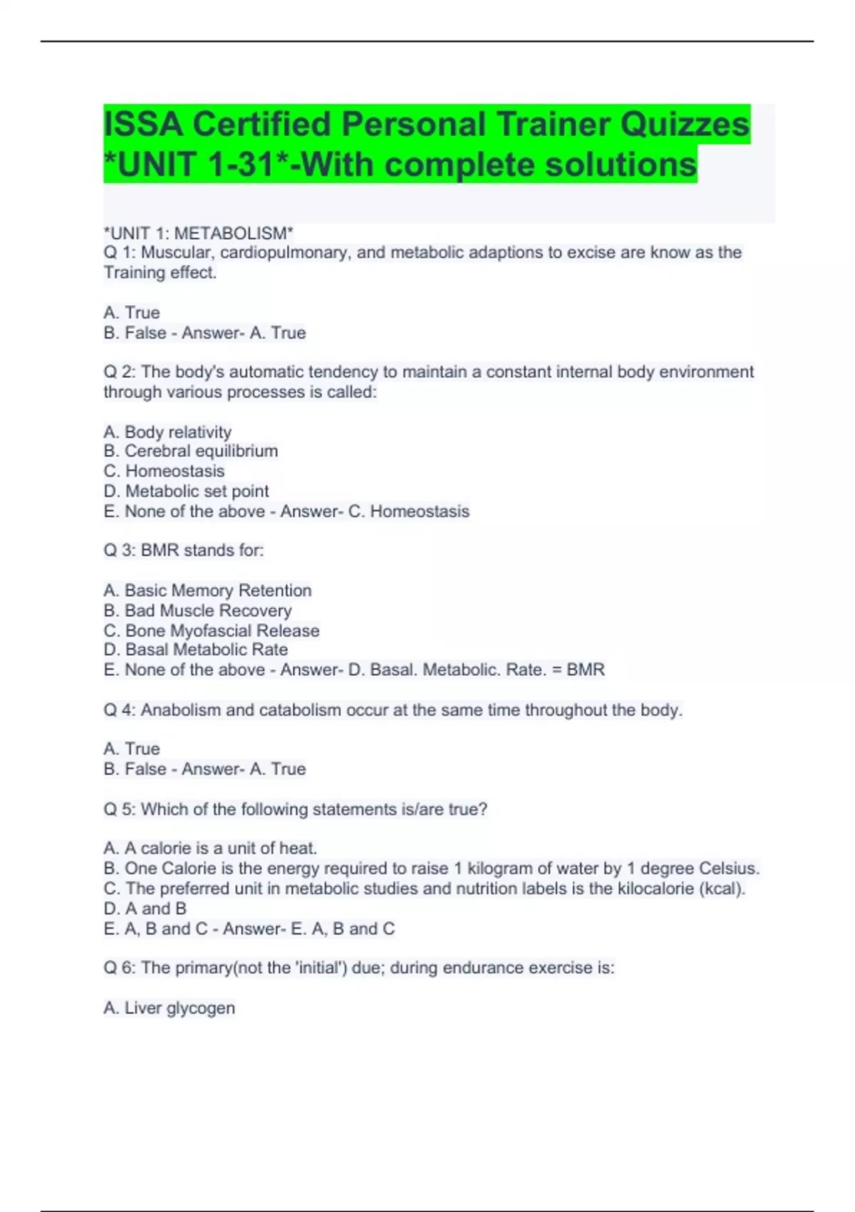 ISSA Certified Personal Trainer Quizzes *UNIT 1-31*-With complete solutions