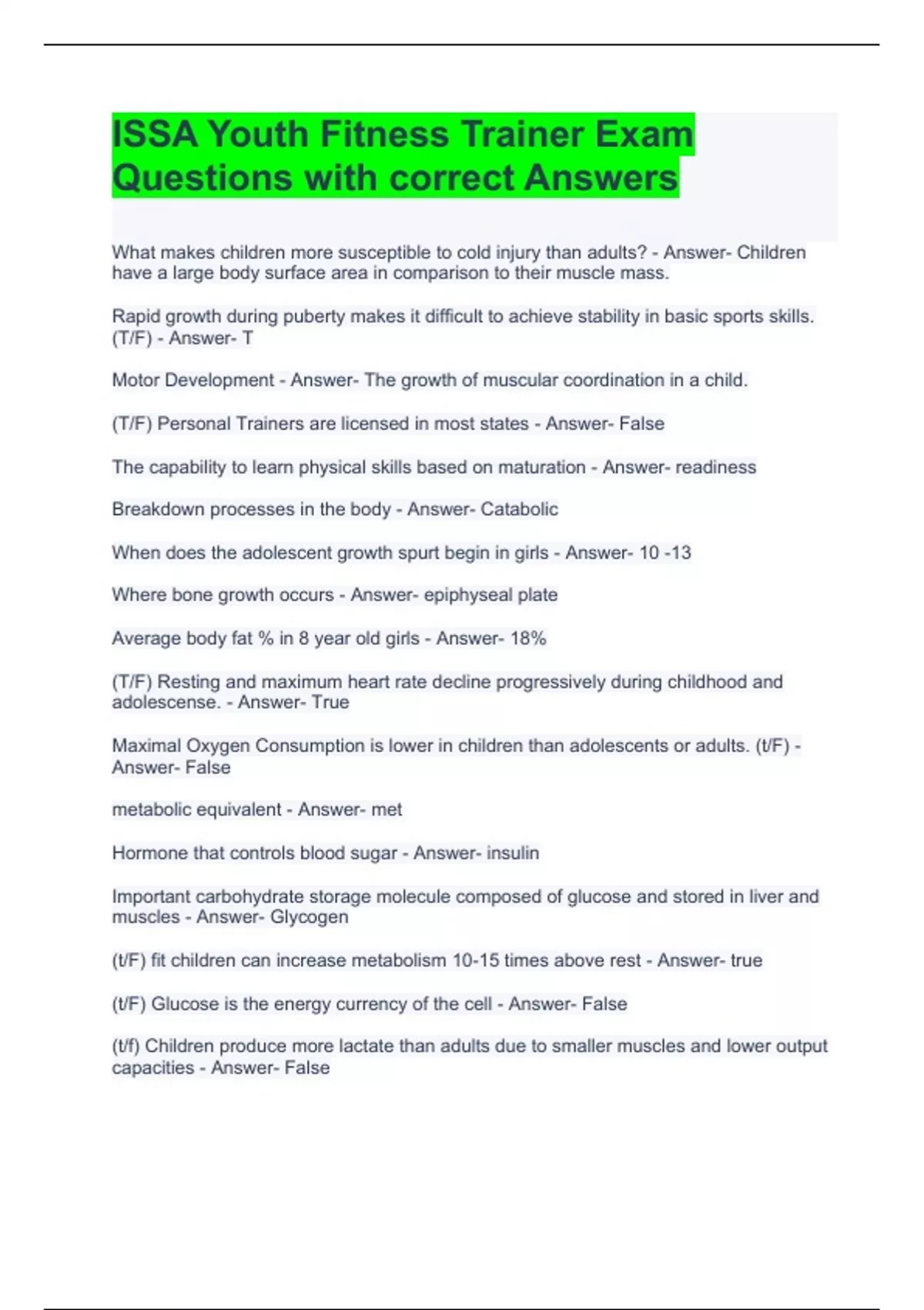 issa youth fitness trainer exam questions with cor