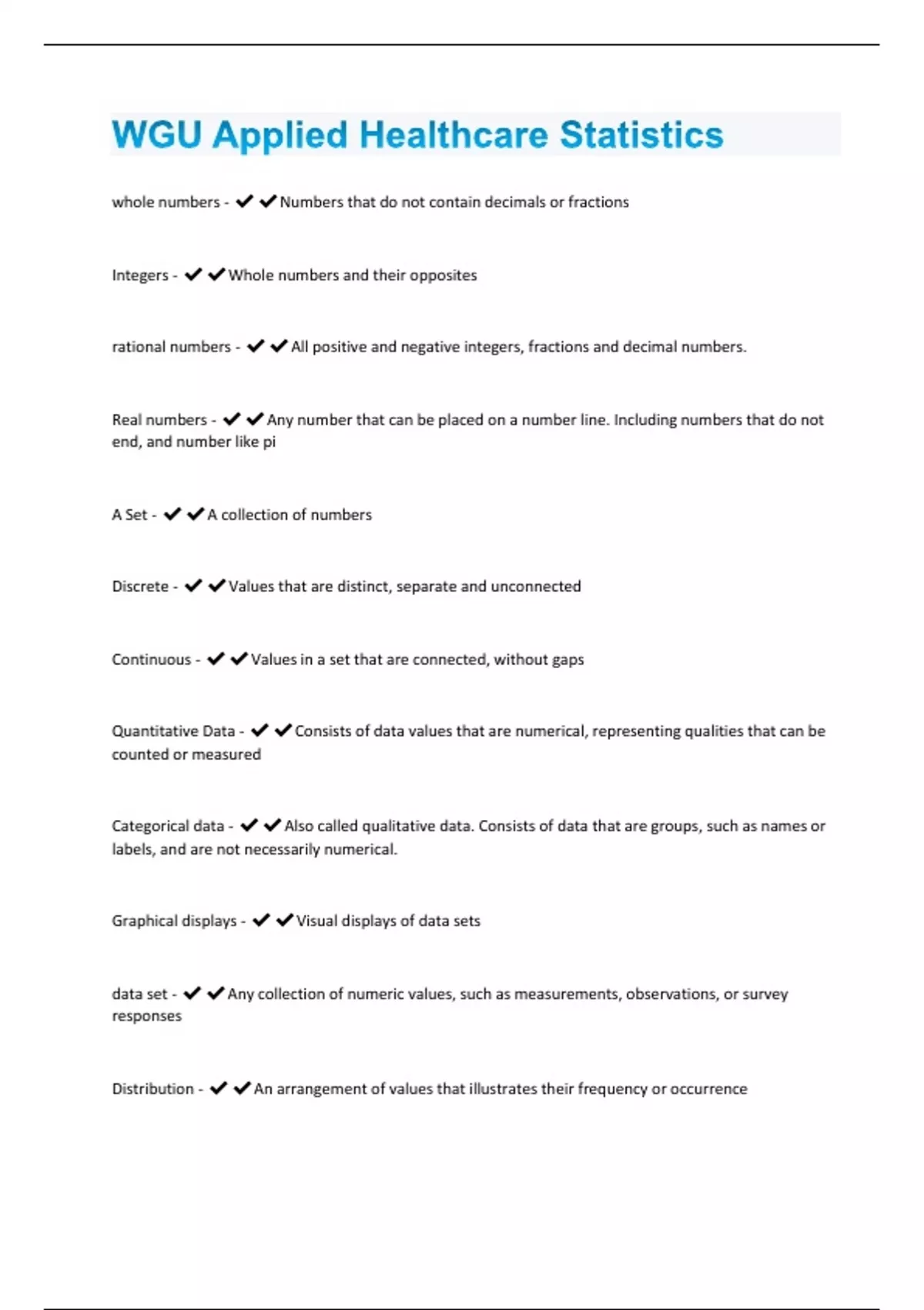 whole numbers - Numbers that do not contain decimals or fractions Integers - Whole numbers and their opposites rational numbers - All positive and negative integers, fractions and decimal numbers. Real numbers - Any number that can be placed on a number line. Including numbers that do not end, and number like pi A Set - A collection of numbers Discrete - Values that are distinct, separate and unconnected Continuous - Values in a set that are connected, without gaps Quantitative Data - Consists of data values that are numerical, representing qualities that can be counted or measured Categorical data - Also called qualitative data. Consists of data that are groups, such as names or labels, and are not necessarily numerical. Graphical displays - Visual displays of data sets data set - Any collection of numeric values, such as measurements, observations, or survey responses Distribution - An arrangement of values that illustrates their frequency or occurrencePie chart - A graphical display that shows data in categories as percentages of a circle Bar chart - A graph that displays data that is distributed over groups or categories
