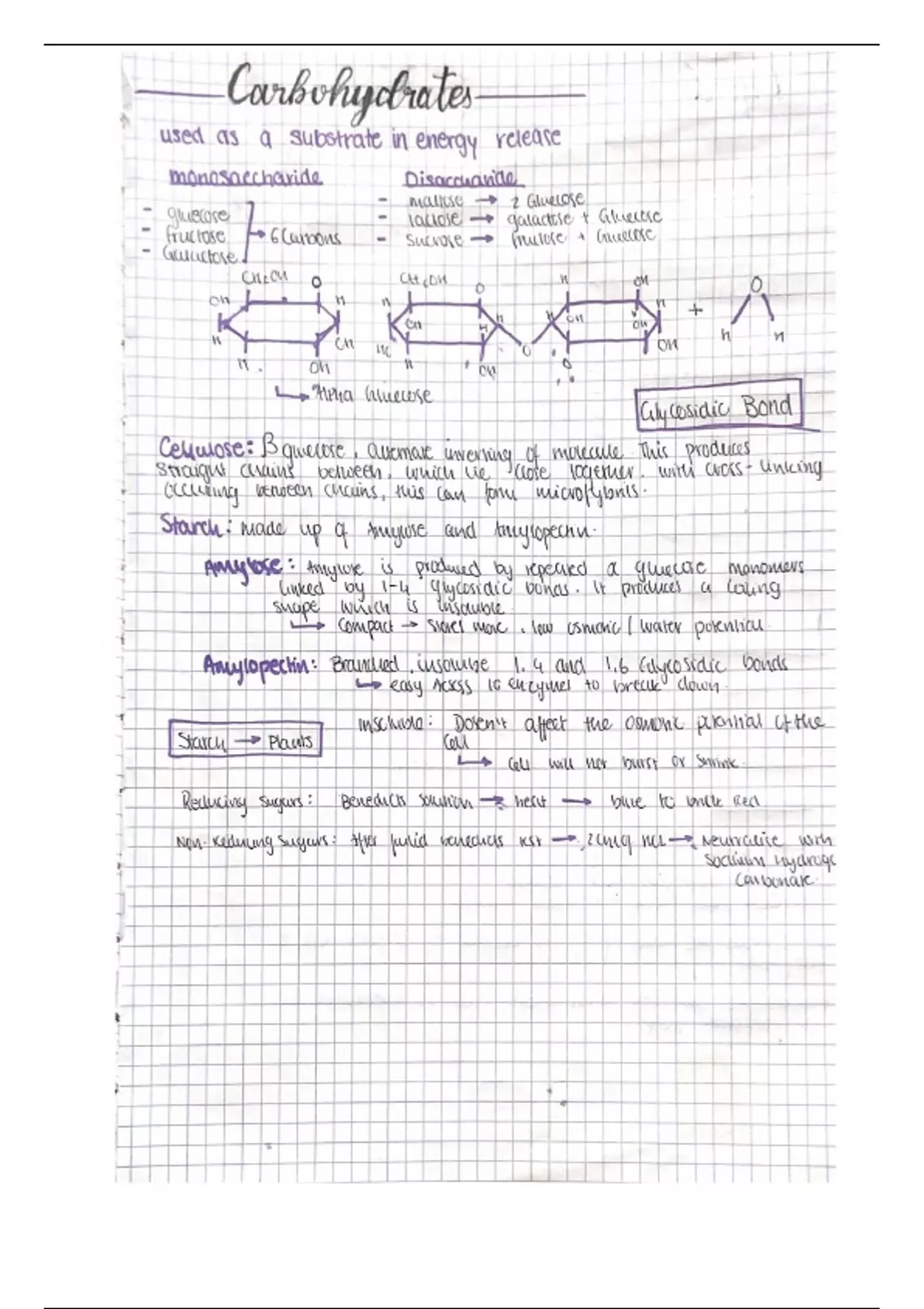 AS Level Biology Edexcel notes on carbohydrates and lipids. Handwritten. Grade A* on exams