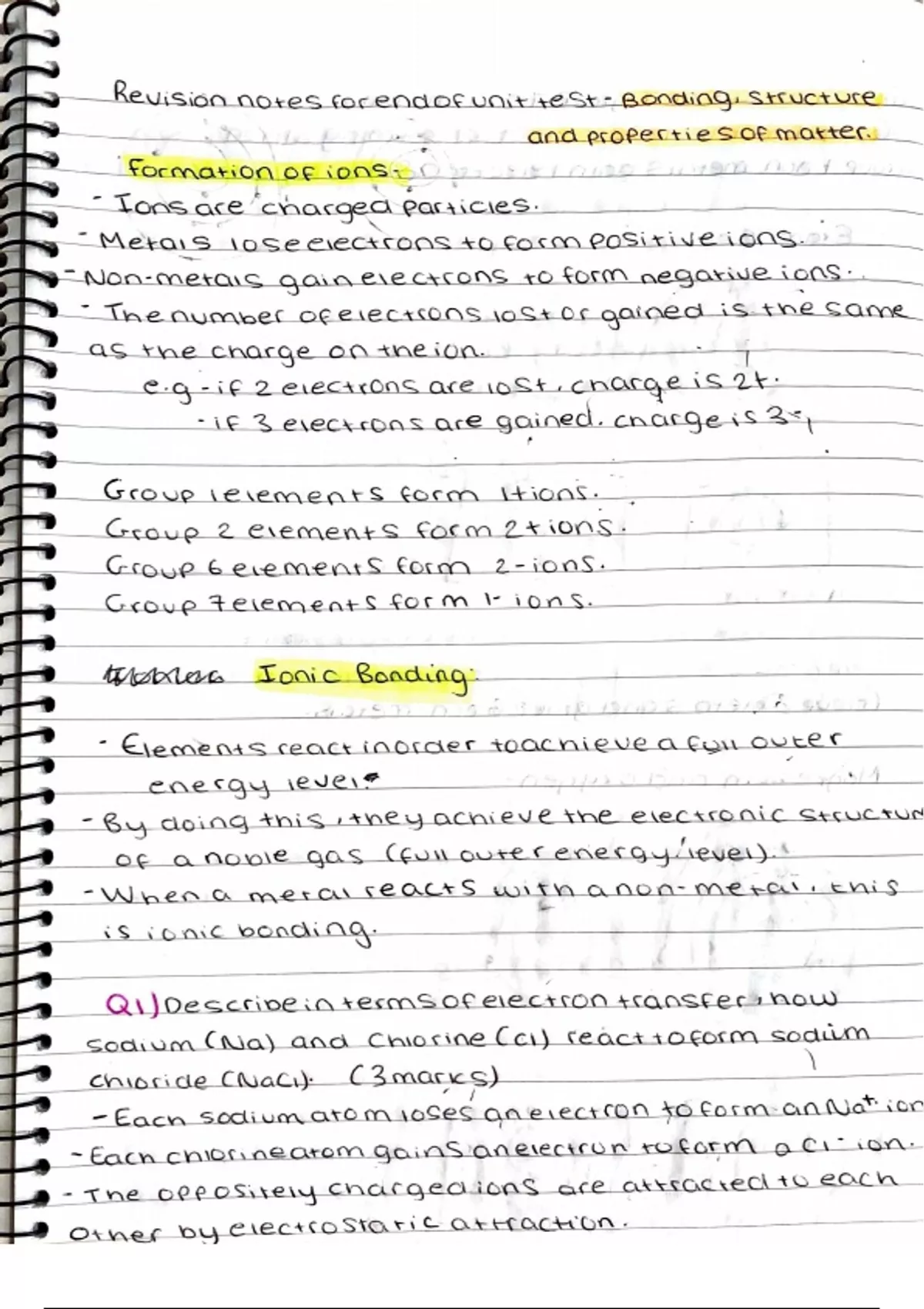 Hand-written notes suitable for the AQA GCSE specification. Contains notes on formation of ions, ionic bonding, ionic compounds, covalent bonding, metallic bonding, simple and giant covalent structures, polymers and states of matter. Includes diagrams, key terminology and a range of examples :)
