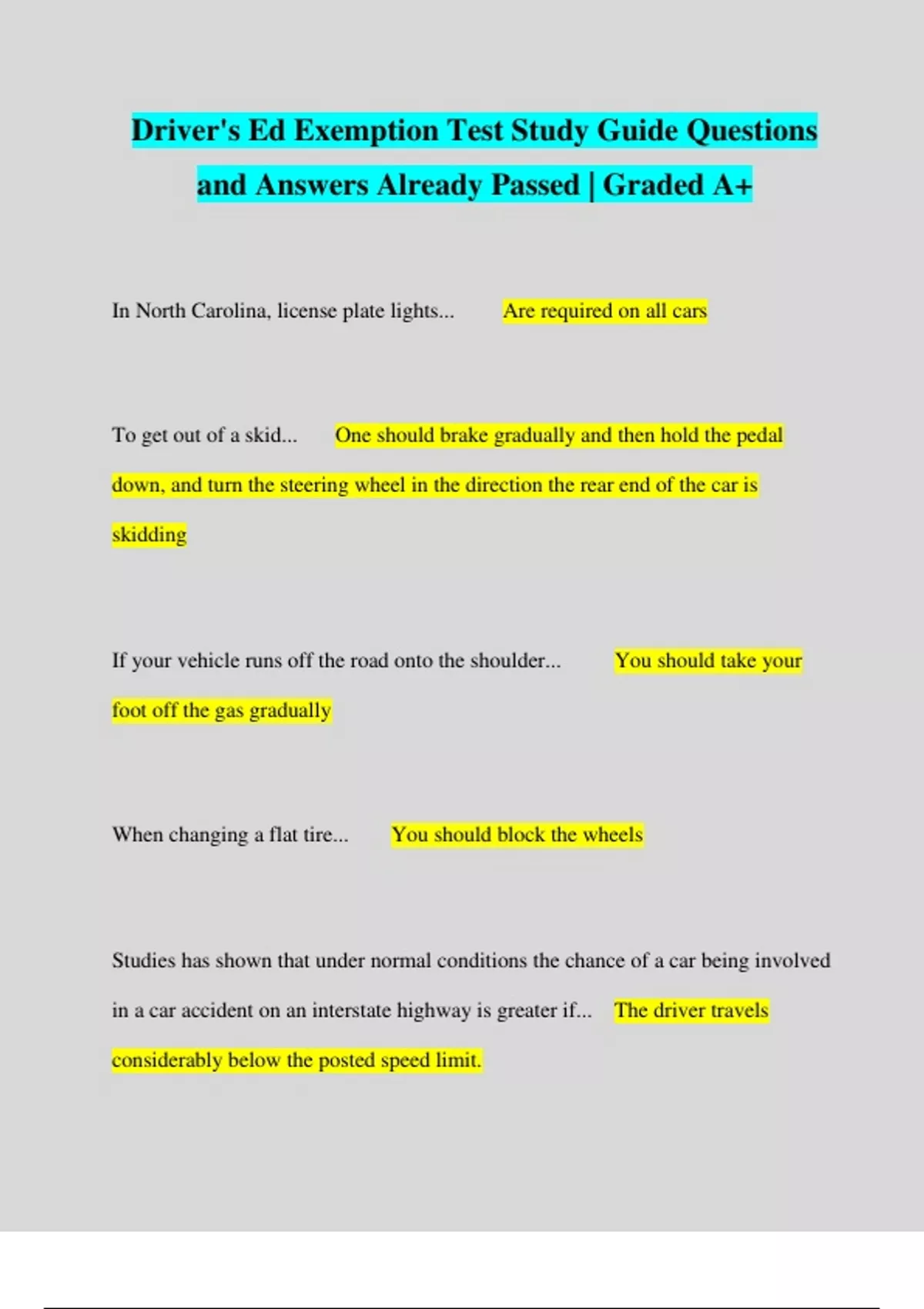 Driver's Ed Exemption Test Study Guide Questions and Answers Already Passed | Graded A+ In North Carolina, license plate lights... Are required on all cars To get out of a skid... One should brake gradually and then hold the pedal down, and turn the steering wheel in the direction the rear end of the car is skidding If your vehicle runs off the road onto the shoulder... You should take your foot off the gas gradually When changing a flat tire... You should block the wheels Studies has shown that under normal conditions the chance of a car being involved in a car accident on an interstate highway is greater if... The driver travels considerably below the posted speed limit.