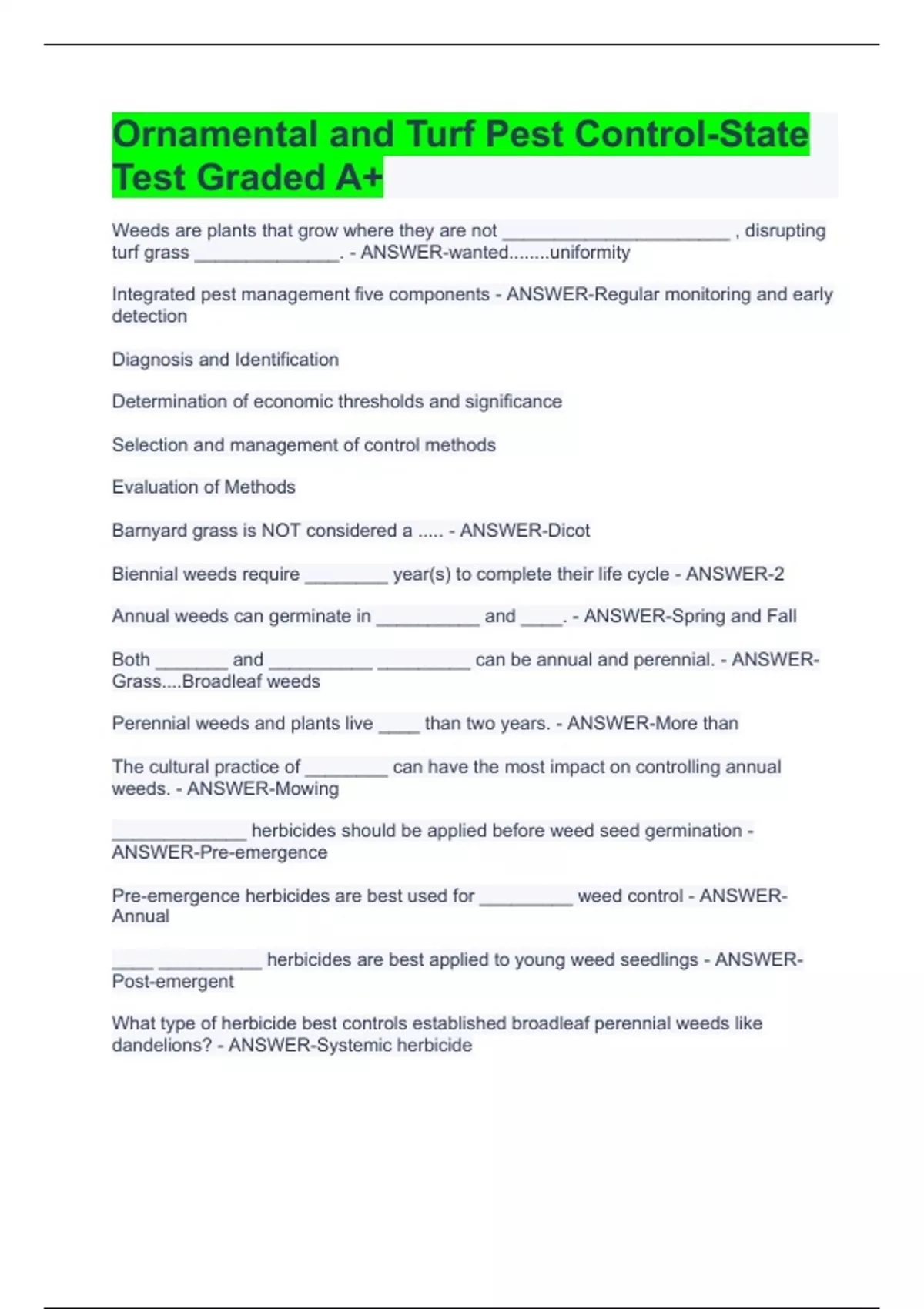 Weeds are plants that grow where they are not ______________________ , disrupting turf grass ______________. - ANSWER-wanted........uniformity Integrated pest management five components - ANSWER-Regular monitoring and early detection Diagnosis and Identification Determination of economic thresholds and significance Selection and management of control methods Evaluation of Methods Barnyard grass is NOT considered a ..... - ANSWER-Dicot Biennial weeds require ________ year(s) to complete their life cycle - ANSWER-2 Annual weeds can germinate in __________ and ____. - ANSWER-Spring and Fall Both _______ and __________ _________ can be annual and perennial. - ANSWER-Grass....Broadleaf weeds Perennial weeds and plants live ____ than two years. - ANSWER-More than The cultural practice of ________ can have the most impact on controlling annual weeds. - ANSWER-Mowing _____________ herbicides should be applied before weed seed germination - ANSWER-Pre-emergence Pre-emergence herbicides are best used for _________ weed control - ANSWER-Annual ____ __________ herbicides are best applied to young weed seedlings - ANSWER-Post-emergent What type of herbicide best controls established broadleaf perennial weeds like dandelions? - ANSWER-Systemic herbicide