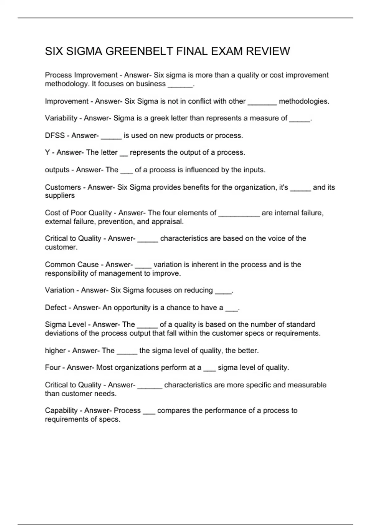 SIX SIGMA GREENBELT FINAL EXAM REVIEW