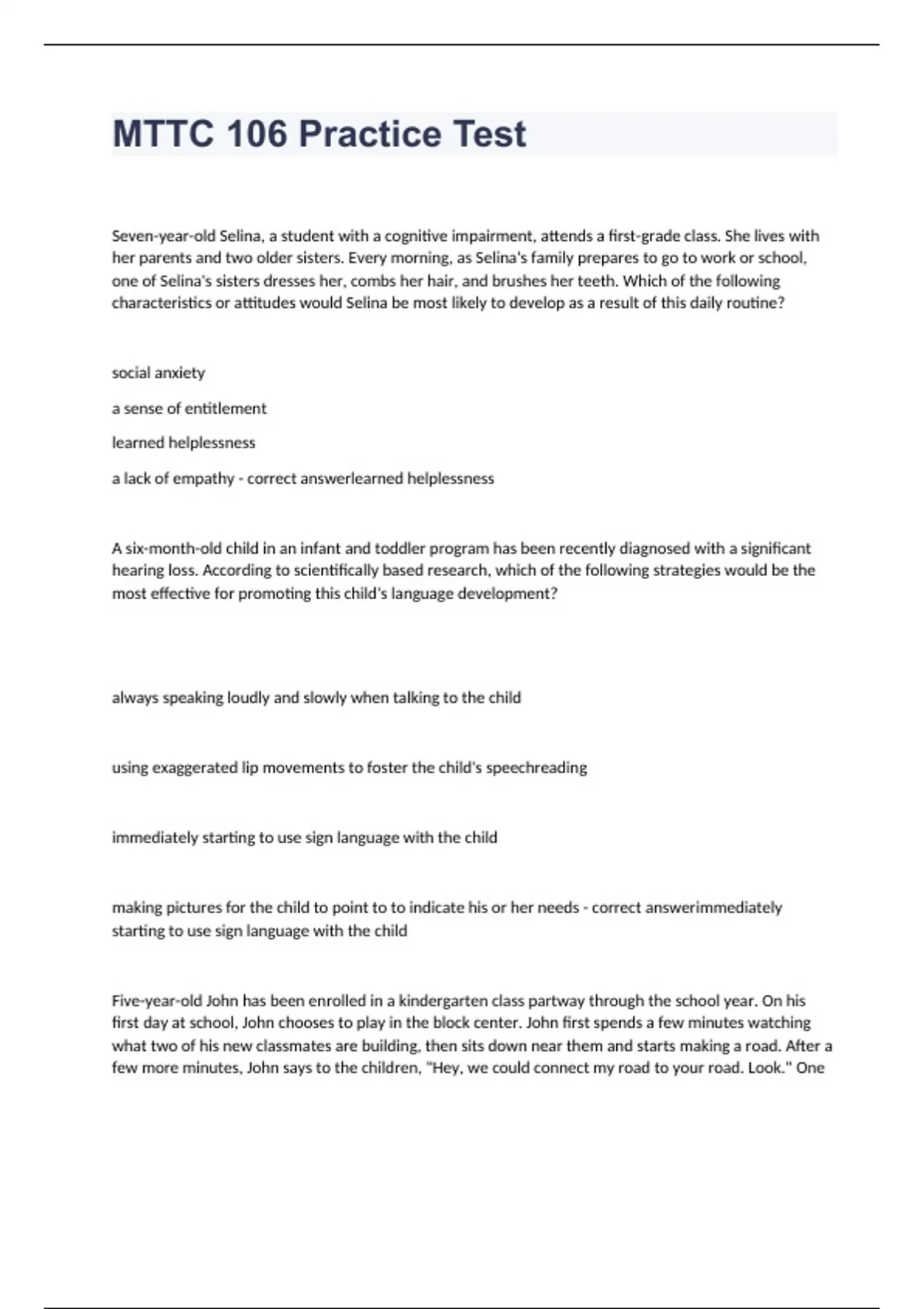 Seven-year-old Selina, a student with a cognitive impairment, attends a first-grade class. She lives with her parents and two older sisters. Every morning, as Selina's family prepares to go to work or school, one of Selina's sisters dresses her, combs her hair, and brushes her teeth. Which of the following characteristics or attitudes would Selina be most likely to develop as a result of this daily routine? social anxiety a sense of entitlement learned helplessness a lack of empathy - correct answerlearned helplessness A six-month-old child in an infant and toddler program has been recently diagnosed with a significant hearing loss. According to scientifically based research, which of the following strategies would be the most effective for promoting this child's language development? always speaking loudly and slowly when talking to the child using exaggerated lip movements to foster the child's speechreading immediately starting to use sign language with the child making pictures for the child to point to to indicate his or her needs - correct answerimmediately starting to use sign language with the child Five-year-old John has been enrolled in a kindergarten class partway through the school year. On his first day at school, John chooses to play in the block center. John first spends a few minutes watching what two of his new classmates are building, then sits down near them and starts making a road. After a few more minutes, John says to the children, "Hey, we could connect my road to your road. Look." One of the other children says, "Yea