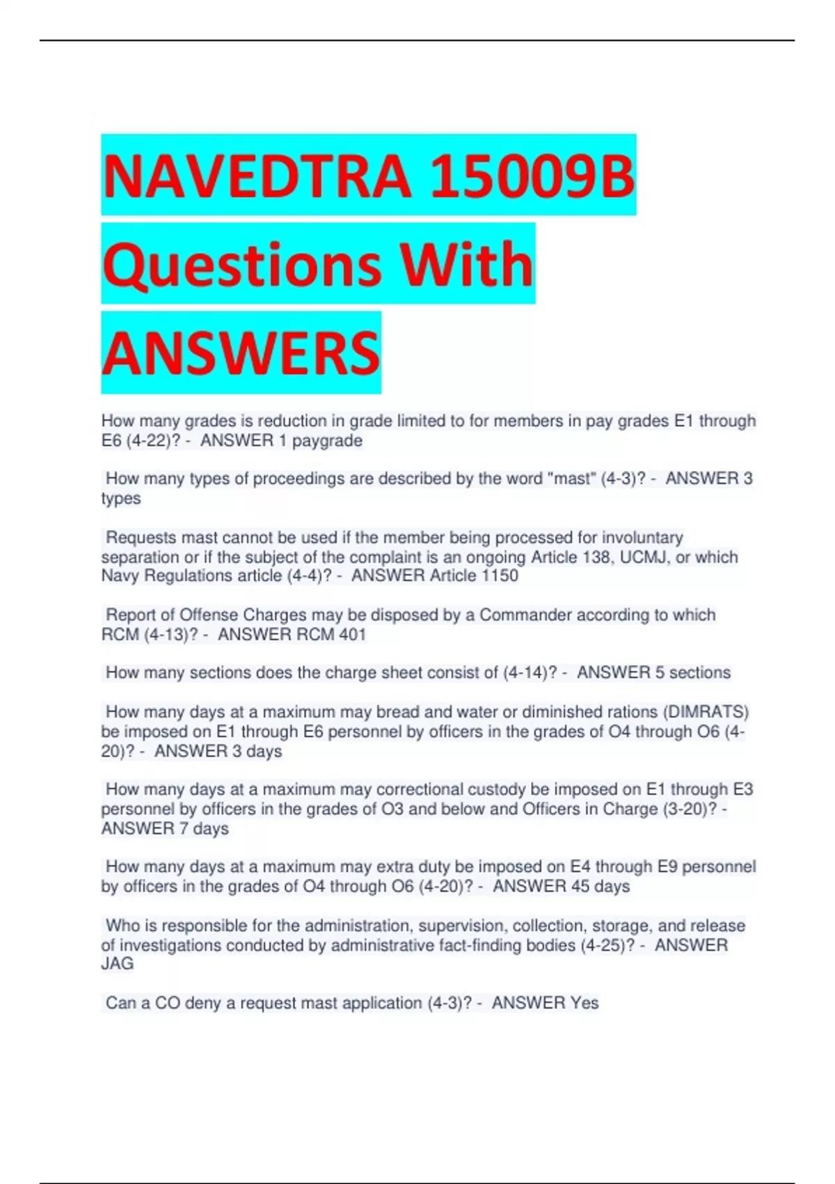 NAVEDTRA 15009B Questions With ANSWERS How many grades is reduction in grade limited to for members in pay grades E1 through E6 (4-22)? - ANSWER 1 paygrade How many types of proceedings are described by the word "mast" (4-3)? - ANSWER 3 types Requests mast cannot be used if the member being processed for involuntary separation or if the subject of the complaint is an ongoing Article 138, UCMJ, or which Navy Regulations article (4-4)? - ANSWER Article 1150 Report of Offense Charges may be disposed by a Commander according to which RCM (4-13)? - ANSWER RCM 401 How many sections does the charge sheet consist of (4-14)? - ANSWER 5 sections How many days at a maximum may bread and water or diminished rations (DIMRATS) be imposed on E1 through E6 personnel by officers in the grades of O4 through O6 (4- 20)? - ANSWER 3 days How many days at a maximum may correctional custody be imposed on E1 through E3 personnel by officers in the grades of O3 and below and Officers in Charge (3-20)? - ANSWER 7 days How many days at a maximum may extra duty be imposed on E4 through E9 personnel by officers in the grades of O4 through O6 (4-20)? - ANSWER 45 days Who is responsible for the administration, supervision, collection, storage, and release of investigations conducted by administrative fact-finding bodies (4-25)? - ANSWER JAG Can a CO deny a request mast application (4-3)? - ANSWER Yes Which form should be completed to submit a request mast application (4-4)? - ANSWER NAVPERS 1336/