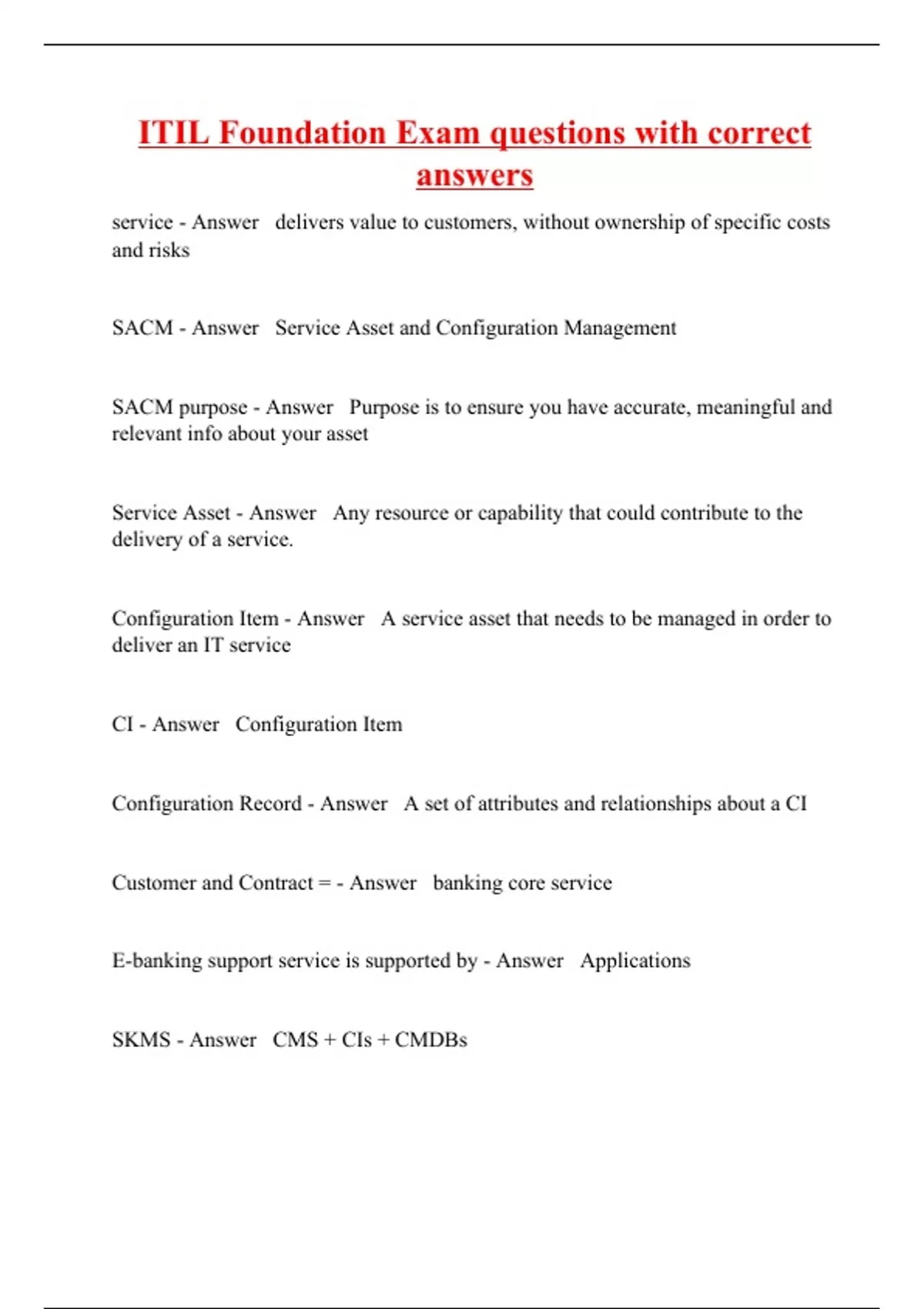 ITIL Foundation Exam questions with correct answers