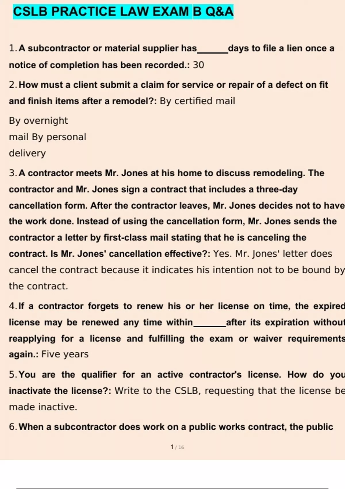 CSLB PRACTICE LAW EXAM B QUESTIONS AND ANSWERS GRADED A+