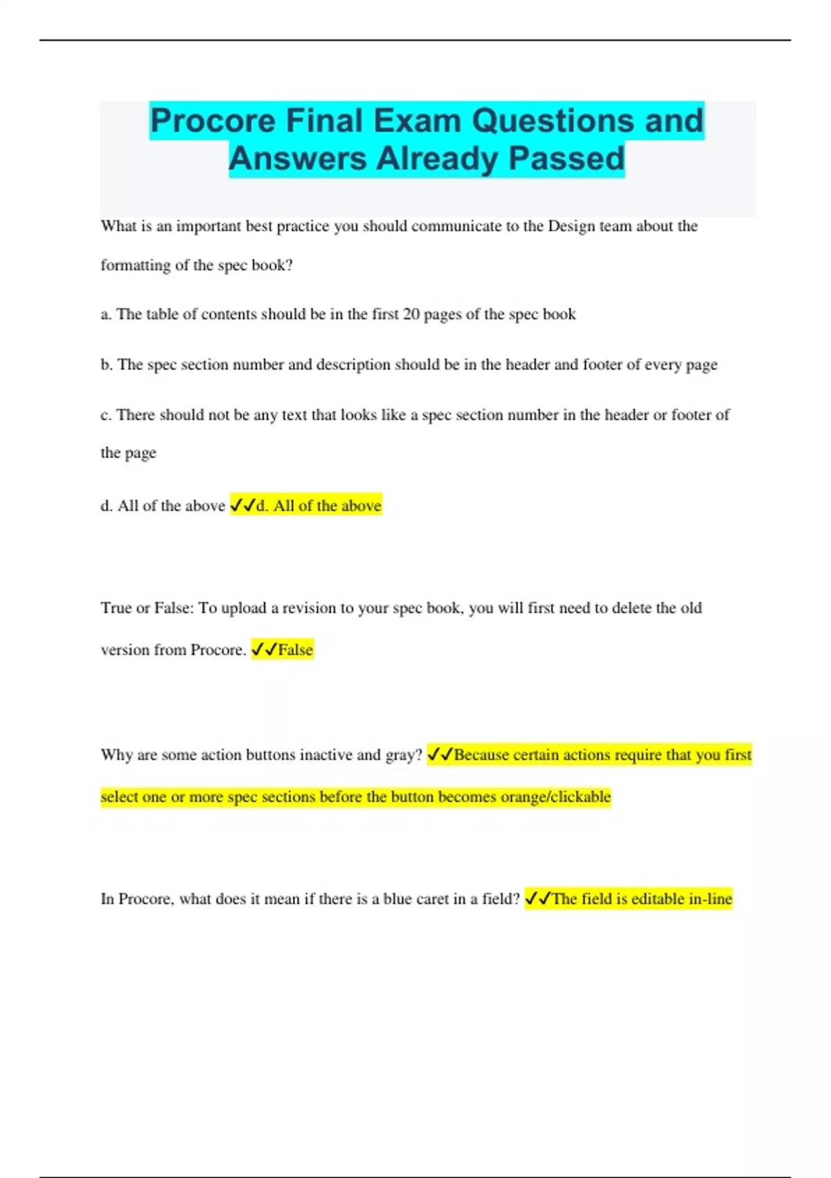Procore Final Exam Questions and Answers Already Passed What is an important best practice you should communicate to the Design team about the formatting of the spec book? a. The table of contents should be in the first 20 pages of the spec book b. The spec section number and description should be in the header and footer of every page c. There should not be any text that looks like a spec section number in the header or footer of the page d. All of the above d. All of the above True or False: To upload a revision to your spec book, you will first need to delete the old version from Procore. False Why are some action buttons inactive and gray? Because certain actions require that you first select one or more spec sections before the button becomes orange/clickable In Procore, what does it mean if there is a blue caret in a field? The field is editable in-line True or False: If you have a project with more than one building or area, you should enable the "Drawings by Area" feature. True True or False: When you click a project's Drawings tool, you should expect to see the project's "current set" of drawings. (i.e. The most recently uploaded revisions of each drawing.) True If you see this icon next to a drawing, what does it mean? square & triangle The drawing contains manually added markups If you see this icon next to a drawing, what does it mean? SK The drawing has sketches associated with it Who can view drawing markups on your 'Personal' layer? Only you True or False: You can now have your Design Team upload drawings directly to the Drawings tool without having the drawings be published immediately. True True or False: You can add correspondence types by selecting from a template or creating your own. True Which permission level on the Photos tool does Procore recommend you give to architects and engineers who are collaborators on the project if you want them to upload photos, but not have access to the configuration settings? Standard Which upload option should you choose if you would like to add markups before the photo is added to Procore? Take photo True or False: As a best practice, you should create your entire project schedule directly in Procore. False True or False: When an issue occurs on the jobsite that may impact and cause a delay to the current project's schedule, you should instruct your team to create a "Schedule Change Request" using the Schedule tool. True If you would like to allow your external subcontractors to submit their submittals in Procore without giving them full access to the tool, which permission level should you assign them? Standard Who is the Submittal Manager? A user who will receive notification emails whenever the submittal is responded to or updated What happens when the "Ball in Court" (status) on a submittal switches to you? a. The submittal will appear in the "My Open Items" section on your home page b. You will see a response box above the General Information section in the submittal c. You will receive an email notifying you that the submittal requires your attention d. All of the above d. All of the above True or False: If a user is not included on the initial workflow of a submittal, he or she cannot respond to the submittal. False Which submittal workflow should be used if you only want a submittal to be assigned to a single person at a time, where that person must add a response before the next person in the workflow can respond? Sequential Approval Workflow What is the best way to inform contractors that upon further review, the punch list item that they marked as "fixed" still requires additional work before it can be marked as resolved? Mark the item as "Unresolved" from the Drawings or Punch List tools What does it mean when a meeting is in "Minutes" mode? Meeting notes have been logged or are currently being logged True or False: You can only create follow-up meetings from a meeting in "Agenda" mode. False Who can view "private" meetings in Procore? a. No one but the user who originally created the meeting b. Users that are listed as invited attendees or are on the distribution list c. Users with 'Admin' permission on the Meetings tool d. B and C d. B and C True or False: Team members entered into the RFI's Responsible Party field will receive notification emails regarding the RFI. False True or False: It is recommended that you link the RFI to a drawing in the Drawings tool. True True or False: As a project manager, a best practice is to keep documents uploaded into Procore (e.g. Specifications, Drawings, etc.) up-to-date with the "current set" (i.e. the most recent revision). True True or False: Procore recommends that RFIs are filtered through a project manager or "RFI Manager" who enters them into Procore and distributes them as needed. True