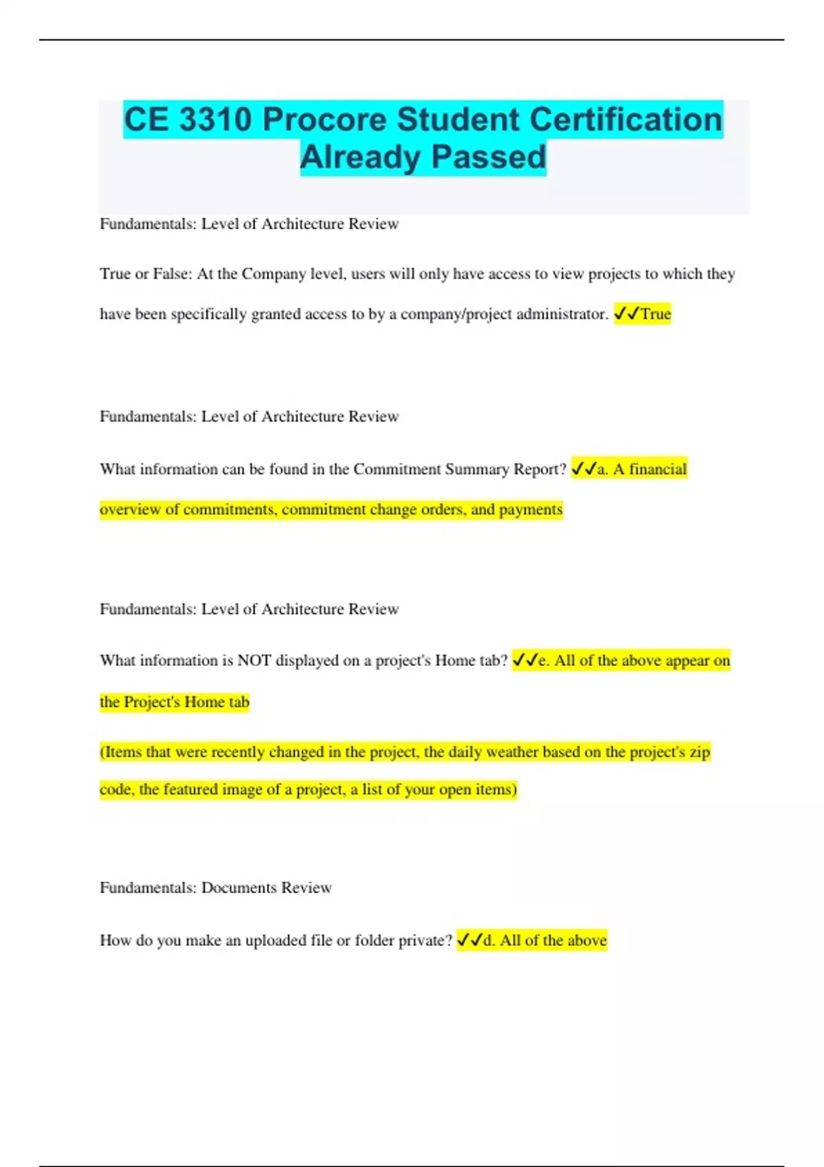 CE 3310 Procore Student Certification Already Passed Fundamentals: Level of Architecture Review True or False: At the Company level, users will only have access to view projects to which they have been specifically granted access to by a company/project administrator. True Fundamentals: Level of Architecture Review What information can be found in the Commitment Summary Report? a. A financial overview of commitments, commitment change orders, and payments Fundamentals: Level of Architecture Review What information is NOT displayed on a project's Home tab? e. All of the above appear on the Project's Home tab (Items that were recently changed in the project, the daily weather based on the project's zip code, the featured image of a project, a list of your open items) Fundamentals: Documents Review How do you make an uploaded file or folder private? d. All of the above (Click the padlock icon so that it's locked/closed, move it into a private folder, mark the "Make Private" checkbox under a document's "File Permissions" section) Fundamentals: Documents Review What is the best way to be notified of changes made to a file or folder? c. Use the built-in file tracking feature Fundamentals: Documents Review True or False: Previously uploaded versions/revisions of a file are preserved in Procore and are available for download in the file's Version Log. True Fundamentals: Documents Review How do you add a document to a project? e. All of the above (Send a file to the project's unique email address, upload a file using Procore's Windows Desktop application, Procore Drive, drag and drop a file into a folder's designated "Upload Queue" section, or click the "Browse" button to select a file from your local computer) Fundamentals: Documents Review True or False: There is no way to validate whether or not a user (who has access to view the file) has downloaded the file from Procore. False Fundamentals: Upload Drawings Review True or False: If you upload a multi-page drawing set (as a single PDF), Procore will automatically split up the set into individual drawings. a. True Fundamentals: Upload Drawings Review Once a drawing has been reviewed and published, which