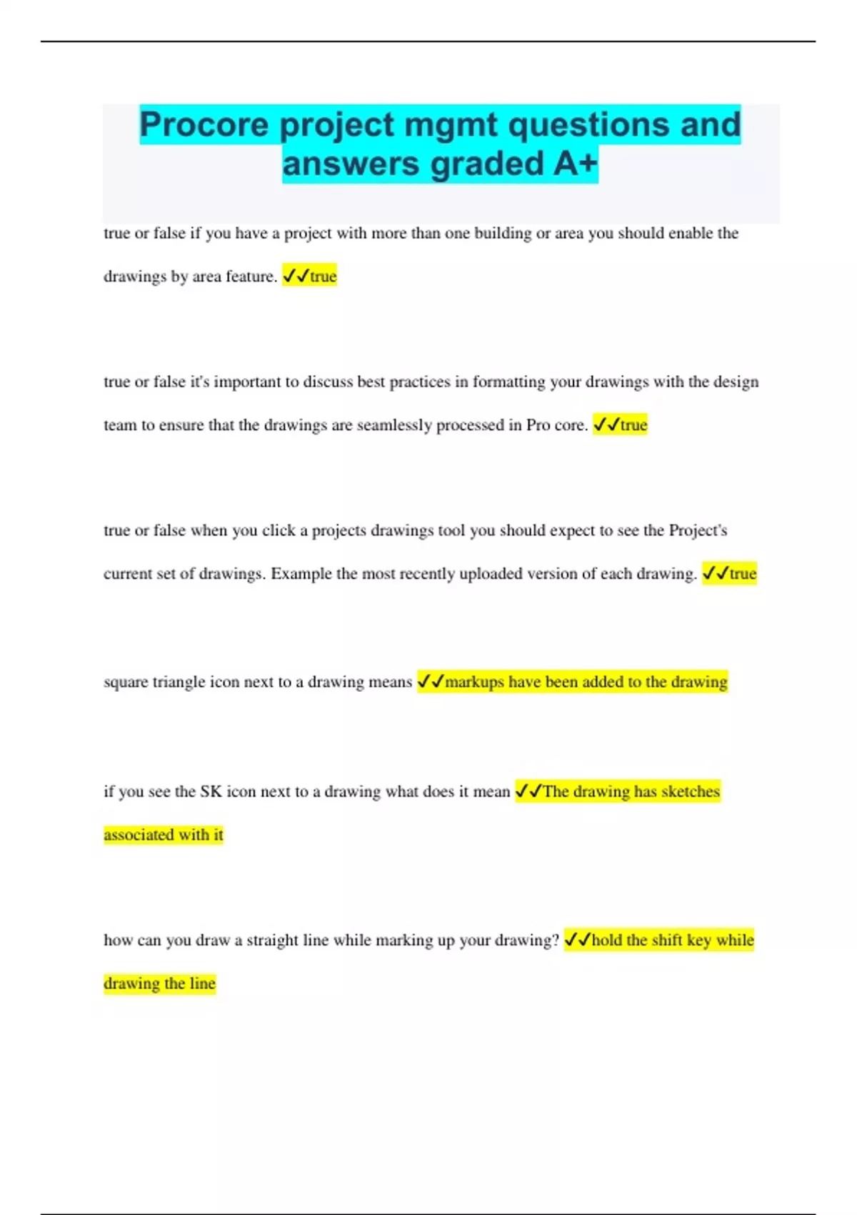 Procore project mgmt questions and answers graded A+ true or false if you have a project with more than one building or area you should enable the drawings by area feature. true true or false it's important to discuss best practices in formatting your drawings with the design team to ensure that the drawings are seamlessly processed in Pro core. true true or false when you click a projects drawings tool you should expect to see the Project's current set of drawings. Example the most recently uploaded version of each drawing. true square triangle icon next to a drawing means markups have been added to the drawing if you see the SK icon next to a drawing what does it mean The drawing has sketches associated with it how can you draw a straight line while marking up your drawing? hold the shift key while drawing the line who can view drawing markups on your personal layer? only you true or false when you add a mark-up to a drawing any more cups will be immediately available to your team without further action on your part false true or false you can now have your design team upload drawings directly to the drawings tool without having the drawings be published immediately. true you should upload shop drawings to procuras drawings tool false true or false procore automatically send an email to users with admin permissions on the drawings tool when new drawings have been uploaded and are ready to be reviewed and published true what is an important best practice you should communicate to the design team about the formatting of the spec book? all of the above true or false before you publish your spec book to the team you should make sure there is a break between every spec section. true true or false to upload a revision to your spec book you will first need to delete the old version from procore false why are some action buttons inactive and gray? because certain actions require that you first select one or more spec sections before the button becomes active in Orange true or false when you delete a specification from the specifications list page you will delete the specification and all of its revisions false in Pro core what does it mean if a field has a blue carrot in the top corner of the cell? the field is editable in line which action are you unable to perform from the PDF viewer of a spec section? export as a CSV file true or false you can only access and view the project spec book in the specifications tool false true or false your field team should have access to specifications in the specifications tool true who should be set up as subscribers to the specifications tool everyone on the project field team if you would like to allow your external subcontractors to submit their submittals in procore without giving them full access to the tool which permission level should you assign them standard true or false when you delete a submittal in procore it is permanently deleted and unrecoverable false true or false when you save a submittal as a draft no notifications are sent out to the members of the distribution list and workflow true what is the submittal manager a user who is the gatekeeper of the submittal and is in charge of facilitating a submittals workflow making sure that it is collected and reviewed by all appropriate people. what happens when the ball in court on a submittal switches to you? all of the above true or false if a user is not included on the initial workflow of a submittal he or she cannot respond to the submittal. false what should you do if a submittals rejected by member of the workflow? distribute the current submittal and create a revision from The submittals View page which submittal approval configuration allows multiple people to be able to approve at the same time? parallel approval which submittal approval configuration has one person to reply at a time controlling the submittals falling Court forcing them to consider the last person's response before they submit their own? sequential workflow true or false you can integrate your bluebeam studio Prime account with procor true true or false as a best practice you should create your schedule completely in procore false besides the schedule tool where else can you view the current days scheduled tasks the Project's homepage true or false when an issue occurs on site that may impact and caused a delay to the current project schedule you should instruct your team to create a schedule change request using the schedule tool true true or false as a best practice you should create calendar items in Pro core Four Construction related test that will impact the current project schedule false true or false you can upload schedule is generated by project manager. Com into procore schedule tool true what's the recommended way of uploading your project schedule file to procore? use procore Drive when you see a text field in Pro core that has a blue carrot in the top right corner of the cell what does it mean? the text field can be edited what does it mean when a meeting is in minutes mode? meeting notes have been logged or are currently being logged true or false you can only create follow-up meetings from a meeting in agenda mode false what information is not carried forward when you create a follow-up meeting closed items true or false when a meeting is in draft mode you will not be able to distribute the agenda to any attendees true who can view private meetings B & C true or false after your meetings agenda is saved in procore you will need to distribute the meeting in order for the invited attendees and members of the distribution list to receive an email notification of the upcoming meeting true true or false you can access your meetings on your mobile device true which permission level on the photos tool does procore recommend you give to Architects and Engineers who are collaborators on the project if you want them to upload photos but not have access to the configuration settings? standard which members level sh