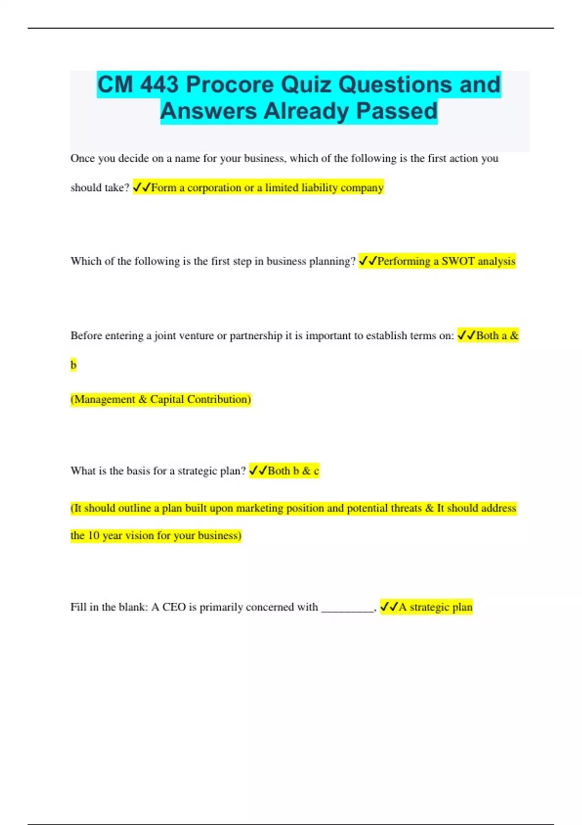 CM 443 Procore Quiz Questions and Answers Already Passed Once you decide on a name for your business, which of the following is the first action you should take? Form a corporation or a limited liability company Which of the following is the first step in business planning? Performing a SWOT analysis Before entering a joint venture or partnership it is important to establish terms on: Both a & b (Management & Capital Contribution) What is the basis for a strategic plan? Both b & c (It should outline a plan built upon marketing position and potential threats & It should address the 10 year vision for your business) Fill in the blank: A CEO is primarily concerned with _________, A strategic plan Fill in the blank: A marketing plan should _________. Be supported by the business developer In between the time that project leads are generated and contracts are established, which of the following can be used to leverage marketing? Direct Mail Fill in the blank: Business Development is an art because it consists of _____. Both a & c (Image-building & Relationship development) Fill in the blank: Business development is a science because it consists of _____. Both a & b (Consulting & Turning relationships into project opportunities) Typically how long is the Long Sales Cycle in construction? Between 6 months and several years What is intrapreneurship? Starting a business within the confines of an existing business Multiple Answer: Which of the following do both intrapreneurial firms and venture capital firms provide? Advice; Seed Money Which of the following is a reason big businesses often fail when implementing new branches or businesses within their business? All of the above When creating a new business unit, what is the first phase? Strategy In which of the following phases of business creation does a team take on the full responsibility of a business unit? Launch Funding Which of the following would be an example of "micro seed innovation"? Providing employees within a company with a fixed amount of discretionary funds to start their own intrapreneurial ventures Multiple Answer: When you start a new job you often sign an employer agreement that outlines which of the following? Rules against using company resources for personal work; Intellectual Property Rights Fill in the Blank: A non-disclosure agreement allows you to ______. Discuss ideas with other parties and ensure your intellectual property is protected Which of the following is a type of intellectual property protection? All of the above Once you receive funding for your intrepreneurial venture, what is the next step you should take? File for the type of business formation that makes the most sense for our organization or partnership A habit is an acquired mode of behavior that has become nearly or completely ________ . Involuntary Select All That Apply: What are the 3 components of a habit loop? Cue, Routine, Reward Which of the following is one of the 7 Lean Construction Principles? All of the above are Lean Construction Principles Which of the following Lean Construction Principles encourages employees to learn from manageable failures by embracing the acronym F.A.I.L. (First Attempt In Learning)? Continuously Improve According to Lean Construction Principles, waste is anything that does not add value to the customer. True According to the Scrum Framework, how can you build and increase the work capacity of your business? Recognize and take action against waste What are the 3 pillars of the Scrum framework? Transparency, Inspection, Adaptation What are the Scrum values? Respect, Openness, Courage, Focus, Commitment What is true about the product backlog? The product backlog lists everything the team needs to accomplish in the upcoming sprint; The product backlog improves communication effectiveness; The product backlog is created before the sprint begins The phrase, "Walk the Board" refers to the process of reviewing your scrum board in the daily scrum (stand up). Which of the following is a question you can ask yourself and your team during the daily scrum (stand up)? All of the above What percentage of Owners, General Contractors, and Trade Contractors have experienced a dispute or claim in the last 5 years? More than 50% Which of the following do Trade Contractors rank as the issue that has the greatest impact on their business? Warranty Issues True or False: Owners, General Contractors, and Trade Contractors equally rank construction defects as the dispute/claim that has the greatest impact on their businesses. False Which of the following is not one of the top three post-recession risks for contractors? Owners transferring risk to themselves Which of the following is considered to be the top risk evaluation strategy? Formal brainstorming with the team Which of the following is considered an obstacle preventing use of more risk management practices? All of the above True or False: There is an increased tendency for clients to shift project risk to contractors. True which of the following can help contractors combat an increased shift of project risk from clients to contractors Increase risk management strategies True or False: Collaboration increases risk. False How does project management software decrease risk? All of the above Which of the following creates challenges for general contractors who are adopting new technology? Both A & B (employees may be spread across the country & general contractors may already use software that subs are required to work within) True or False: It is not possible to maintain productivity during implementation. False Hyper-departmental technology refers to technology that is being used by how many people in an organization? 1-2 How many magnitudes of organizational technology reach exist? 4 Which of the following magnitudes of organizational technology reach describes a software that is used by one single department? Departmental True or False: Hyper-departmental softwares require company-wid