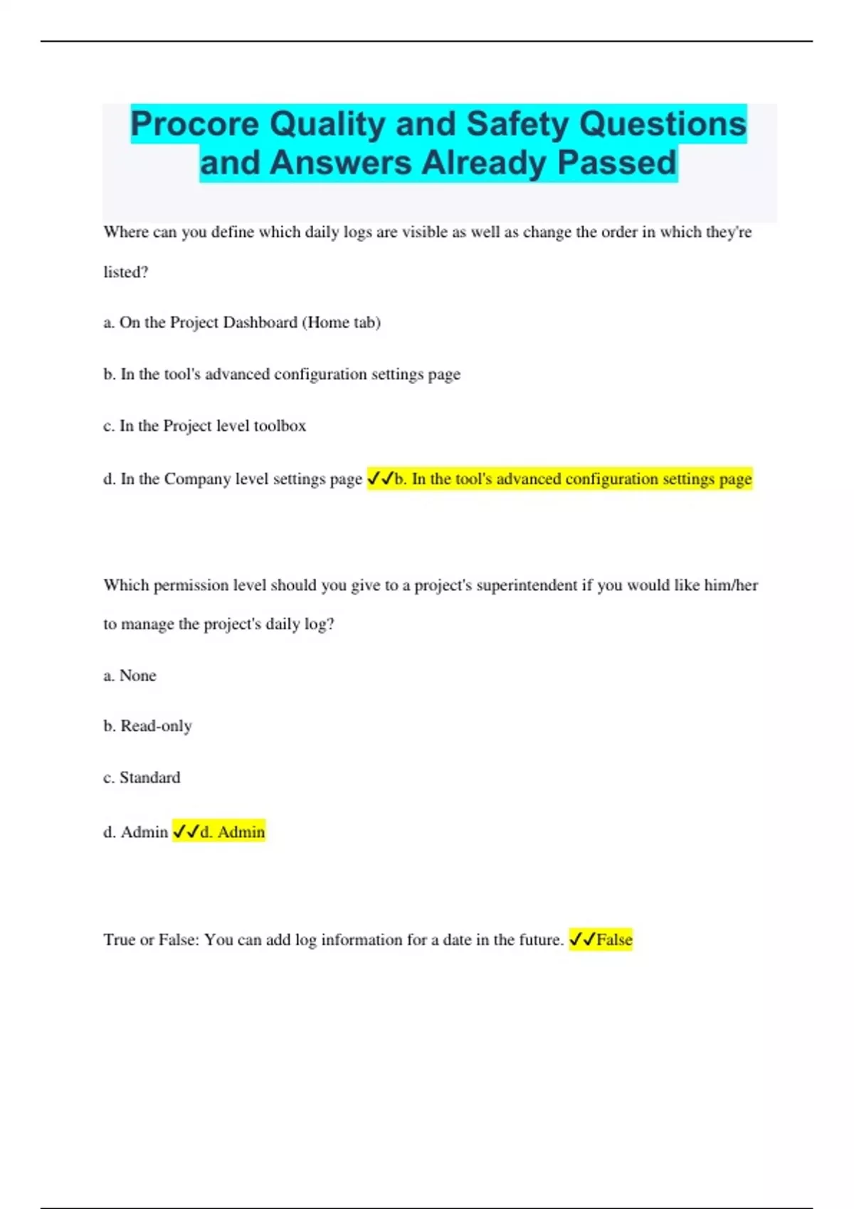 Procore Quality and Safety Questions and Answers Already Passed Where can you define which daily logs are visible as well as change the order in which they're listed? a. On the Project Dashboard (Home tab) b. In the tool's advanced configuration settings page c. In the Project level toolbox d. In the Company level settings page b. In the tool's advanced configuration settings page Which permission level should you give to a project's superintendent if you would like him/her to manage the project's daily log? a. None b. Read-only c. Standard d. Admin d. Admin True or False: You can add log information for a date in the future. False True or False: When you create a new daily log entry by copying one from a previous day, you will still be allowed to edit its information. True True or False: Procore recommends you give your collaborators 'Admin' level permissions to the project's Daily Log tool so your superintendent can "crowd source" the Daily Log. False True or False: With Collaborator Daily Logs enabled, you will be able to approve collaborator-submitted daily logs before they become visible in the project's Daily Log. True How can you give someone who has 'Standard' or 'Read-only' permissions on the Incidents tool access to an incident that's marked as private? a. Add them to the incident's distribution list b. Send the user an email with a hyperlink to the incident c. Clone the incident and assign it to the new user d. You cannot give 'Read-only' and 'Standard' users access to view private incidents. Only 'Admin' users can view private incidents. a. Add them to the incident's distribution list Once an incident has been investigated and resolved, its status should be changed to ________. a. Open b. Resolved c. Closed d. Archived c. Closed True or False: Incident records document the companies and persons affected by the incident, work activities, injury information, and more. True True or False: In order to create a new incident in Procore, you must include at least one incident record. False True or False: You will not be able to record investigation information related to an incident outside of Procore. False True or False: Procore recommends that you only give superintendents 'Read only' permissions to the Incidents tool. False Before using Procore's Incidents tool, you should have a strong understanding of which regulation standards? a. Health Insurance Portability and Accountability Act of 1996 (HIPAA) b. OSHA - Recording and Reporting Occupational Injuries and Illness (29 CFR Part 1904) c. All of the above c. All of the above True or False: Once an incident is created you cannot edit any of the required fields. False Why does Procore recommend managing Inspection templates at the Company level? a. It helps ensure that every project is using the same standardized template b. It helps keep reporting throughout the project simple and easy c. It streamlines the project setup phase d. All of the above d. All of the above True or False: If you have access to the Project level Inspections tool, you also have access to the Company level Inspections tool. False Why would you not be able to create a new inspection for your project? (i.e. the "Create" button is not active/clickable) a. The project does not have any inspection templates b. You do not have 'Standard' or 'Admin' permissions on the project's Inspections tool c. Another user is actively performing an inspection d. Both A and B d. Both A and B When performing an inspection, what should you do after you mark an item as "failed"? a. Create an observation and assign it to the responsible party b. Create a follow-up inspection for the failed item c. Create a change order to fix the failed item d. Create a punch list item and assign it to the responsible party a. Create an observation and assign it to the responsible party True or False: You can only create an observation from directly within the Observations tool. False After the assignee has performed the necessary work to resolve an issue, he/she can change the observation's status to ________. a. Open b. Ready for Review c. Closed d. Archived b. Ready for Review True or False: When you create an observation, it automatically sends an email notification to all responsible parties without further action from you. False True or False: You can add custom observation types to the Observation tool. True True or False: By logging and resolving observations as they come up during the course of construction, the punch list should be much shorter and easier to manage at the end of a project. True If your project has sensitive information or your company wants to prevent external contractors from seeing punch list items for other scopes of work, what can you do to give them a consolidated view where they can only see the punch list items to which they're assigned? a. Give external collaborators 'None' permissions to the Punch List tool b. Give external collaborators 'Admin' permissions to the Punch List tool c. Mark all punch list items private by default d. Use Observations tool instead of the Punch List tool c. Mark all punch list items private by default True or False: Punch List Due Date fields are calculated in business days, not calendar days. False What should subcontractors do when they've fixed their assigned punch list item? a. Mark the item as "Resolved" in Procore b. Mark the item as "Closed" in Procore c. Assign the punch list item to the Superintendent for review d. Assign the punch list item to the Project Manager for review a. Mark the item as "Resolved" in Procore What is the best way to inform subcontractors that upon further review, the punch list item that they marked as "fixed" still requires additional work before it can be marked as resolved? a. Notify the subcontractor using the Emails tool b. Create a new punch list item and assign it to them with the updated information c. Mark the item as "Unresolved" from the Drawings or Punch List tools d. Mark the item as "Close