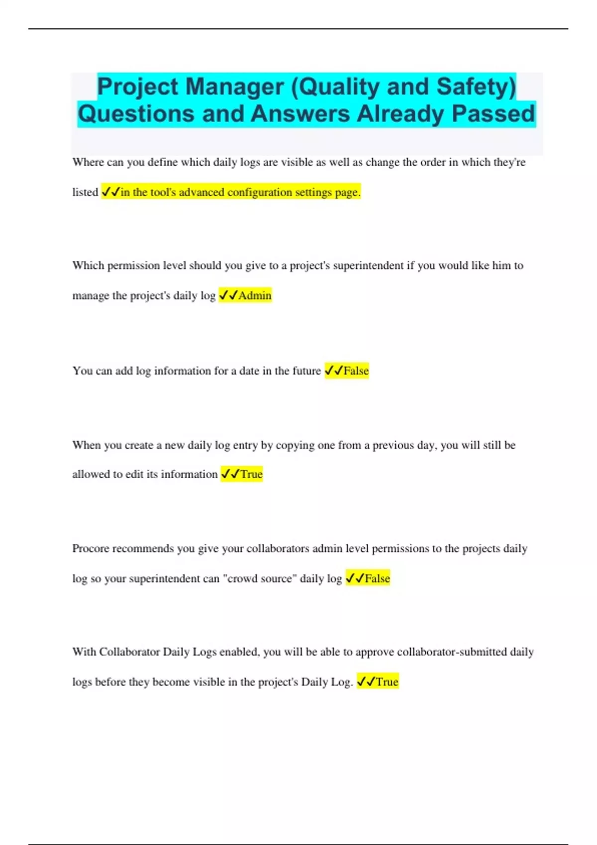 Project Manager (Quality and Safety) Questions and Answers Already Passed Where can you define which daily logs are visible as well as change the order in which they're listed in the tool's advanced configuration settings page. Which permission level should you give to a project's superintendent if you would like him to manage the project's daily log Admin You can add log information for a date in the future False When you create a new daily log entry by copying one from a previous day, you will still be allowed to edit its information True Procore recommends you give your collaborators admin level permissions to the projects daily log so your superintendent can "crowd source" daily log False With Collaborator Daily Logs enabled, you will be able to approve collaborator-submitted daily logs before they become visible in the project's Daily Log. True How can you give someone who has 'Standard' or 'Read-only' permissions on the Incidents tool access to an incident that's marked as private? Add them to the incident's distribution list Once an incident has been investigated and resolved, its status should be changed to Closed Incident records document the companies and persons affected by the incident, work activities, injury information, and more. True In order to create a new incident in Procore, you must include at least one incident record. false You will not be able to record investigation information related to an incident outside of Procore. false Procore recommends that you only give superintendents 'Read only' permissions to the Incidents tool. False Before using Procore's Incidents tool, you should have a strong understanding of which regulation standards? all Once an incident is created you cannot edit any of the required fields. False Why does Procore recommend managing Inspection templates at the Company level? all If you have access to the Project level Inspections tool, you also have access to the Company level Inspections tool. false Why would you not be able to create a new inspection for your project? (i.e. the "Create" button is not active/clickable) B & C When performing an inspection, what should you do after you mark an item as "failed"? Create an observation and assign it to the responsible party You can only create an observation from directly within the Observations tool. false After the assignee has performed the necessary work to resolve an issue, he/she can change the observation's status to Ready for Review When you create an observation, it automatically sends an email notification to all responsible parties without further action from you. false You can add custom observation types to the Observation tool. true By logging and resolving observations as they come up during the course of construction, the punch list should be much shorter and easier to manage at the end of a project true If your project has sensitive information or your company wants to prevent external contractors from seeing punch list items for other scopes of work, what can you do to give them a consolidated view where they can only see the punch list items to which they're assigned? Mark all punch list items private by default Punch List Due Date fields are calculated in business days, not calendar days False What should subcontractors do when they've fixed their assigned punch list item? Mark the item as "Resolved" in Procore What is the best way to inform subcontractors that upon further review, the punch list item that they marked as "fixed" still requires additional work before it can be marked as resolved? Mark the item as "Unresolved" from the Drawings or Punch List tools To avoid misinterpretation of a punch list item, it's recommended that you link the punch item to the related drawing and include photos for additional clarification. true When uploading a form template into Procore, it MUST be in the following file format: .pdf In order for a form to become fillable by end users in Procore, the form template MUST already have designated fillable fields. true Procore will automatically convert any text boxes in your PDF into fillable fields. false Users can fill out forms through Procore's Web and Mobile application. true Users must have at least _______ level permissions or higher on the Project level Forms tool in order to fill out a form Standard Once you fill out and save a form, you cannot modify the form's information. False