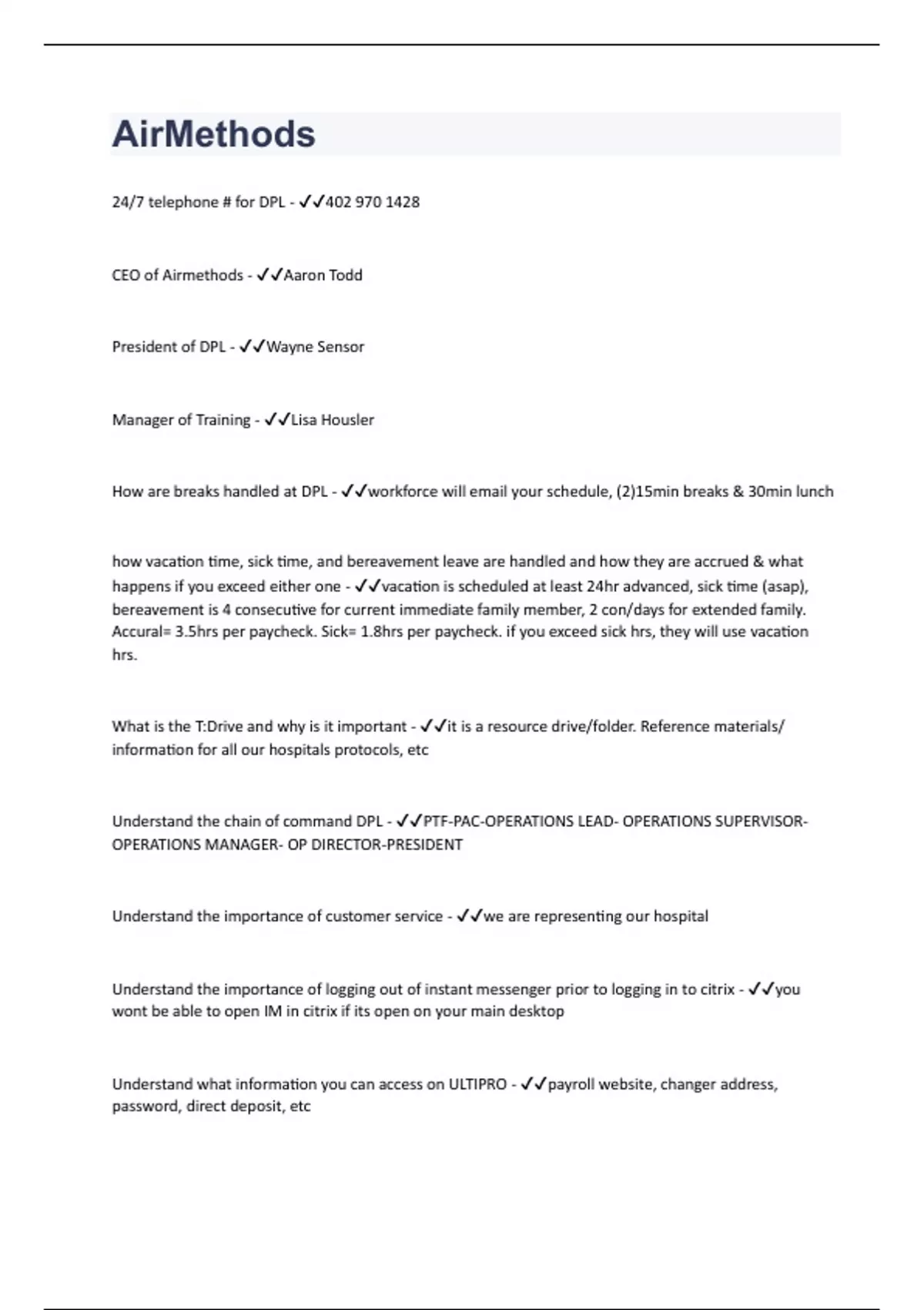 24/7 telephone # for DPL - CEO of Airmethods - Aaron Todd President of DPL - Wayne Sensor Manager of Training - Lisa Housler How are breaks handled at DPL - workforce will email your schedule, (2)15min breaks & 30min lunch how vacation time, sick time, and bereavement leave are handled and how they are accrued & what happens if you exceed either one - vacation is scheduled at least 24hr advanced, sick time (asap), bereavement is 4 consecutive for current immediate family member, 2 con/days for extended family. Accural= 3.5hrs per paycheck. Sick= 1.8hrs per paycheck. if you exceed sick hrs, they will use vacation hrs. What is the T:Drive and why is it important - it is a resource drive/folder. Reference materials/ information for all our hospitals protocols, etc Understand the chain of command DPL - PTF-PAC-OPERATIONS LEAD- OPERATIONS SUPERVISOR- OPERATIONS MANAGER- OP DIRECTOR-PRESIDENT Understand the importance of customer service - we are representing our hospital Understand the importance of logging out of instant messenger prior to logging in to citrix - you wont be able to open IM in citrix if its open on your main desktop Understand what information you can access on ULTIPRO - payroll website, changer address, password, direct deposit, etc