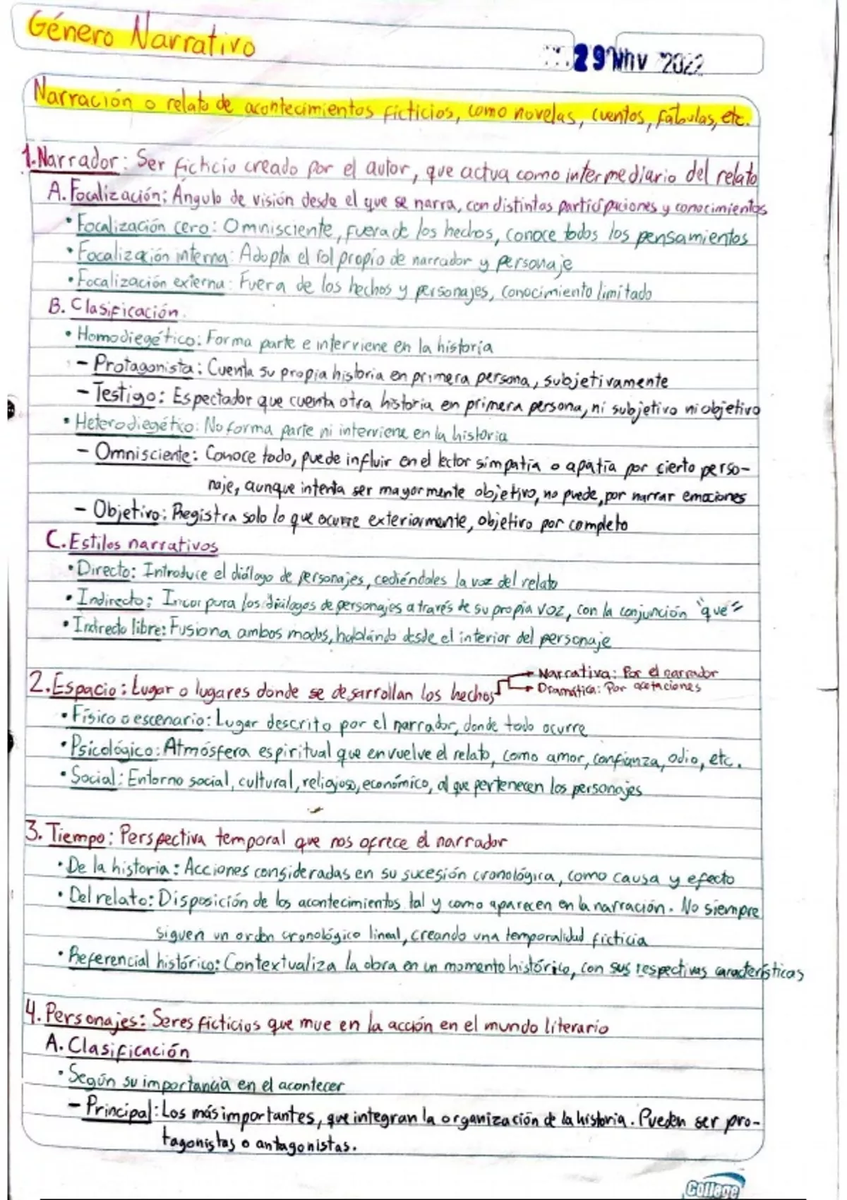 Notas de análisis literario de tipo narrativo. Cubre narrador y sus tipos, analisis de espacio, analisis de tiempo, tipos de personajes, disposición del relato y alteraciones. Explica las partes más necesarias de este tipo de análisis.