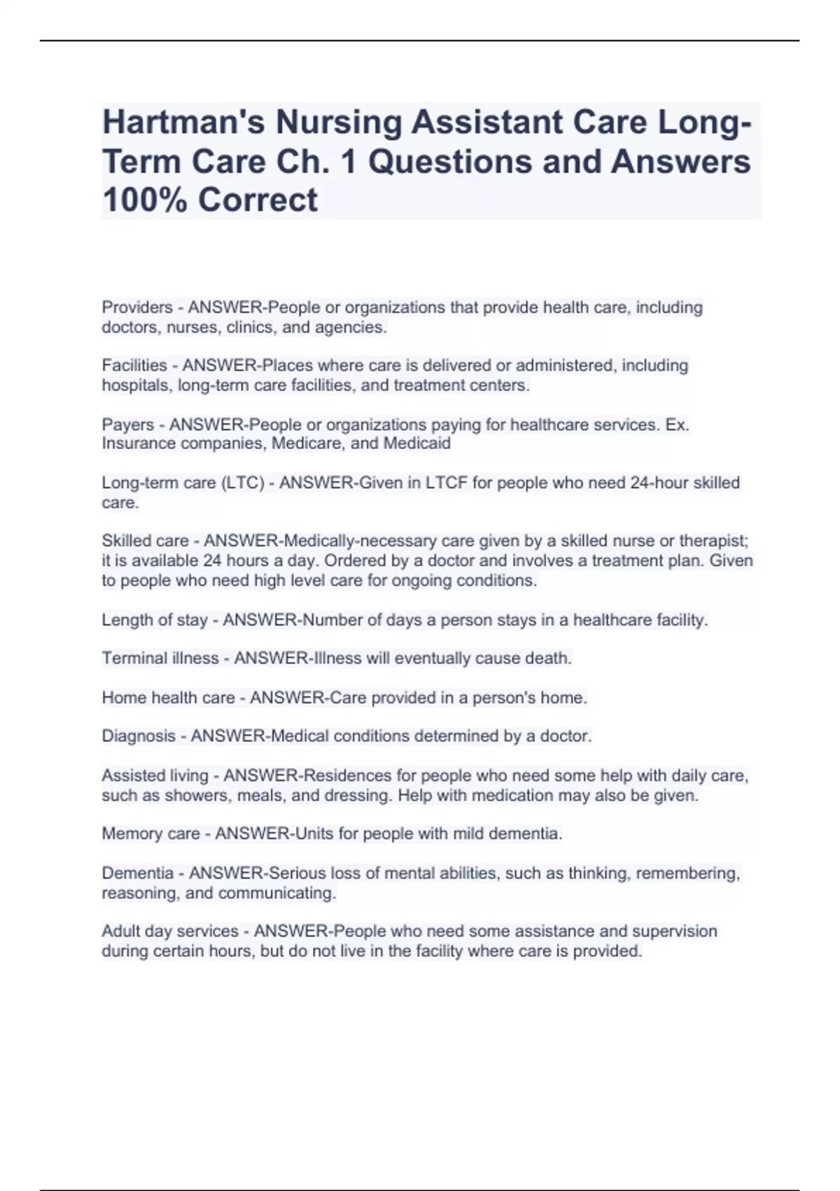Hartman's Nursing Assistant Care Long-Term Care Ch. 1 Questions and Answers 100% CorrectHartman's Nursing Assistant Care Long-Term Care Ch. 1 Questions and Answers 100% CorrectHartman's Nursing Assistant Care Long-Term Care Ch. 1 Questions and Answers 100% Correct Providers - ANSWER-People or organizations that provide health care, including doctors, nurses, clinics, and agencies. Facilities - ANSWER-Places where care is delivered or administered, including hospitals, long-term care facilities, and treatment centers. Payers - ANSWER-People or organizations paying for healthcare services. Ex. Insurance companies, Medicare, and Medicaid Long-term care (LTC) - ANSWER-Given in LTCF for people who need 24-hour skilled care.