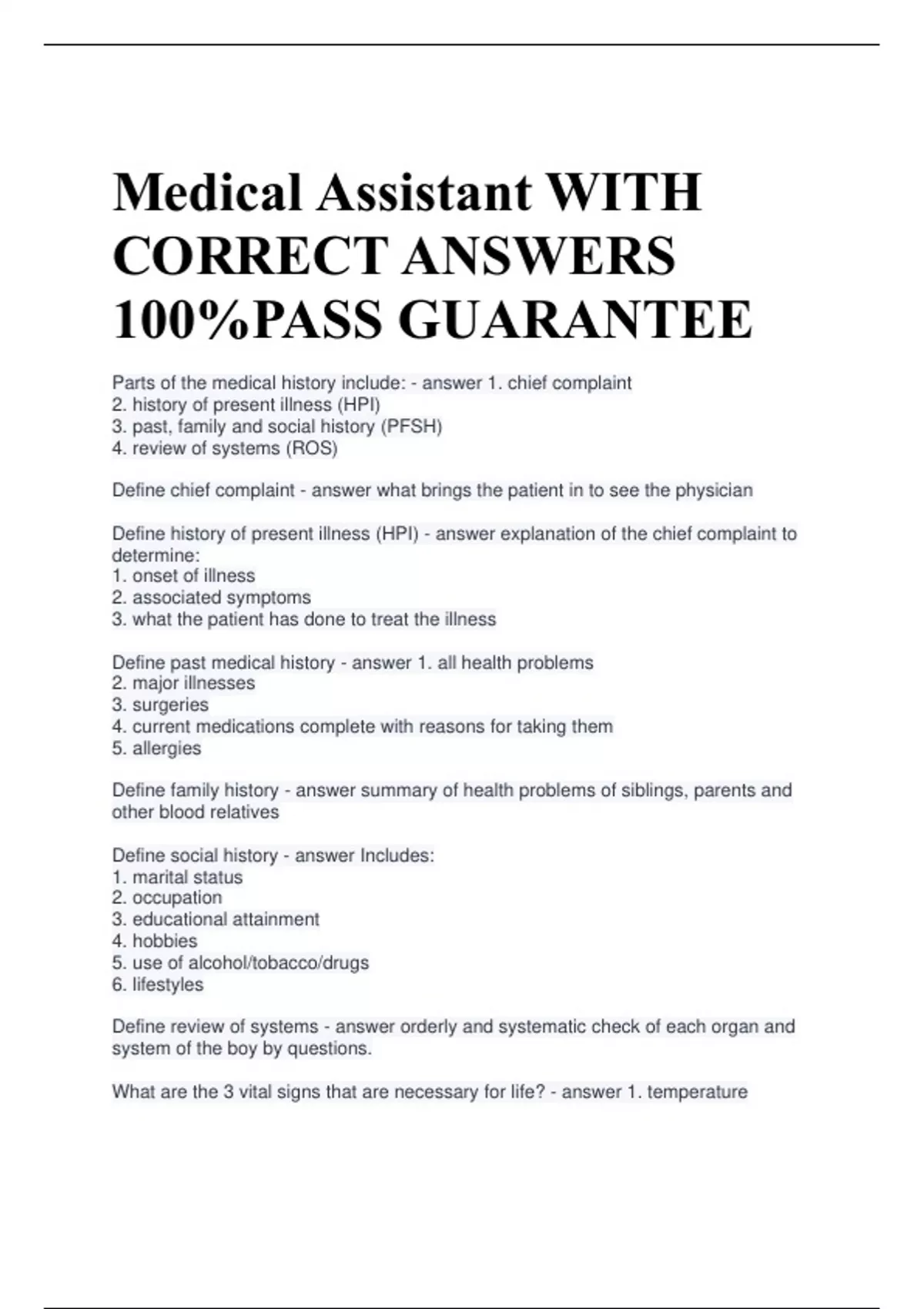 Medical Assistant WITH CORRECT ANSWERS 100%PASS GUARANTEE Parts of the medical history include: - answer 1. chief complaint 2. history of present illness (HPI) 3. past, family and social history (PFSH) 4. review of systems (ROS) Define chief complaint - answer what brings the patient in to see the physician Define history of present illness (HPI) - answer explanation of the chief complaint to determine: 1. onset of illness 2. associated symptoms 3. what the patient has done to treat the illness Define past medical history - answer 1. all health problems 2. major illnesses 3. surgeries 4. current medications complete with reasons for taking them 5. allergies Define family history - answer summary of health problems of siblings, parents and other blood relatives Define social history - answer Includes: 1. marital status 2. occupation 3. educational attainment 4. hobbies 5. use of alcohol/tobacco/drugs 6. lifestyles Define review of systems - answer orderly and systematic check of each organ and system of the boy by questions. What are the 3 vital signs that are necessary for life? - answer 1. temperature 2. respiration 3. heart function (blood pressure) What are the four vital signs of body function? - answer 1. temperature 2. pulse 3. respiration 4. blood pressure What is the normal range of body temperature? - answer 96.6-100.6 F Define body temperature - answer the balance between heat production and heat loss Body temperature is regulated by what structure? - answer the hypothalamus Site for most accurate body temperature - answer Rectum Least accurate site for body temperature - answer Axillary 3 types of fever - answer 1. Intermittent 2. Remittent 3. Continuous Define intermittent fever - answer fluctuating fever that returns to or below baseline then rises again Define remittent fever - answer fluctuating fever that remains elevated: it does not return to baseline temperature Define continuous fever - answer a fever that remains constant above the baseline: it does not fluctuate Which is the most common site for temperatures - answer oral In patients who have just finished eating, drinking, or smoking, how long should you wait before taking a temperature - answer 30 minutes Patients with heart disease should not have which temperature taken? - answer rectal Normal pulse range - answer 60-100 bpm Most accurate pulse - answer apical pulse Normal respiratory range - answer 12 to 20 per minute in adults 3 respiratory rate abnormalities - answer 1. apnea 2. tachypnea 3. bradypnea Define apnea - answer temporary complete absence of breathing which may be a result of a reduction in the stimuli to the respiratory centers of the brain Define tachypnea - answer respiration rate of greater than 40/minute. It is transient in the newborn and maybe caused by hysteria in the adult Define bradypnea - answer decrease in the number of respirations. This occurs during sleep, or certain diseases. Define respiratory rhythm - answer refers to the pattern of breathing. Can vary with age: infants have an irregular rhythm, while adults have regular. 2 abnormal respiratory rythms - answer 1. Cheyenne-Stokes 2. Orthopnea Define Cheyenne-Stokes breathing rate - answer a regular pattern of irregular breathing rate Define orthopnea - answer difficulty or inability to breathe unless in the upright position Patient position when the head is 90 degrees upright - answer high-Fowler's position Define depth of respiration - answer the amount of air that is inspired and expired during each respiration Name 2 abnormalities in the depth of respiration - answer 1. hypoventilation 2. hyperventilation Define hypoventilation - answer state in which reduced amount of air enters the lungs resulting in decreased oxygen level and increased carbon dioxide level in blood. It can be due to breathing that is too shallow, or too slow, or due to diminished lung function Define hyperpnea - answer abnormal increase in the depth and rate of breathing define hyperventilation - answer state in which there is an increased amount of air entering the lungs Define blood pressure - answer the amount of force exerted by the blood on the peripheral arterial walls How is blood pressure expressed - answer mm of Hg The appropriate width of a cuff is what? - answer 40% of the circumference of the limb The appropriate length of the cuff is what? - answer 80% of the circumference of the limb If the blood pressure cuff is too short or narrow, how does this effect bp readings? - answer false high readings The bp cuff is centered over which artery - answer brachial What is the location of the bp cuff in relation to the anticubital crease? - answer 2.5cm above If the brachial artery is far below the heart level, how will this effect the blood pressure - answer false high If the brachial artery is far above heart level, how will this effect the blood pressure reading - answer false low What is the most common artery to use for blood pressure? - answer brachial artery How high should the bp cuff be inflated above the palpatory systolic pressure - answer 30mm Hg What is the rate of release of pressure when taking a bp? - answer 2 to 3mm Hg per second When to you take the systolic bp? - answer the level at which you hear the sounds of at least two consecutive beats When do you take the diastolic bp? - answer When beats disappear What are the 7 common errors in blood pressure measurements? - answer 1. improper cuff size 2. the arm is not at heart level 3. cuff is not completely deflated before use 4. deflation of the cuff is faster than 2-3mm Hg per second 5. the cuff is re-inflated during the procedure 6. improper cuff placement 7. defective equipment Define anthropometric measurements - answer comparative measurements of the body Why is length used in anthropometric measurements? - answer because infants and toddlers are unable to stand for a height measurement What are the 4 principles of physical examination? - answer 1. inspection 2. palpation 3. percussio