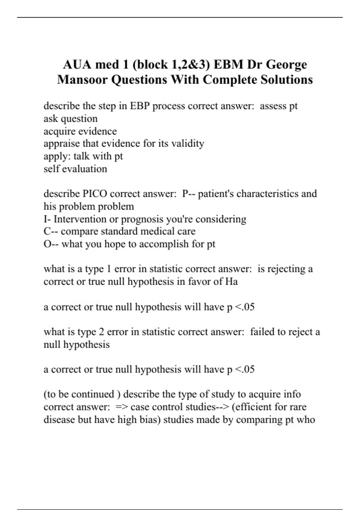 AUA med 1 (block 1,2&3) EBM Dr George Mansoor Questions With Complete Solutions