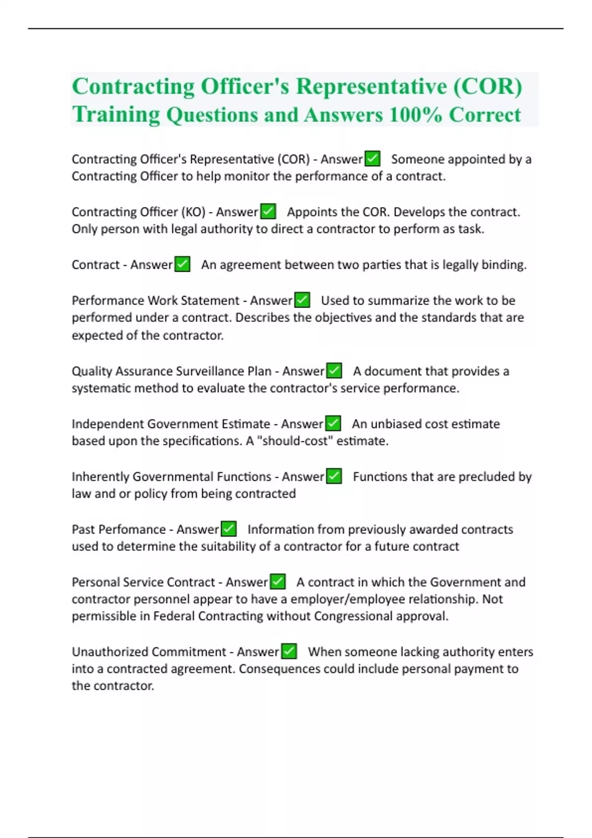 Contracting Officer's Representative (COR) Training Questions and Answers 100% Correct