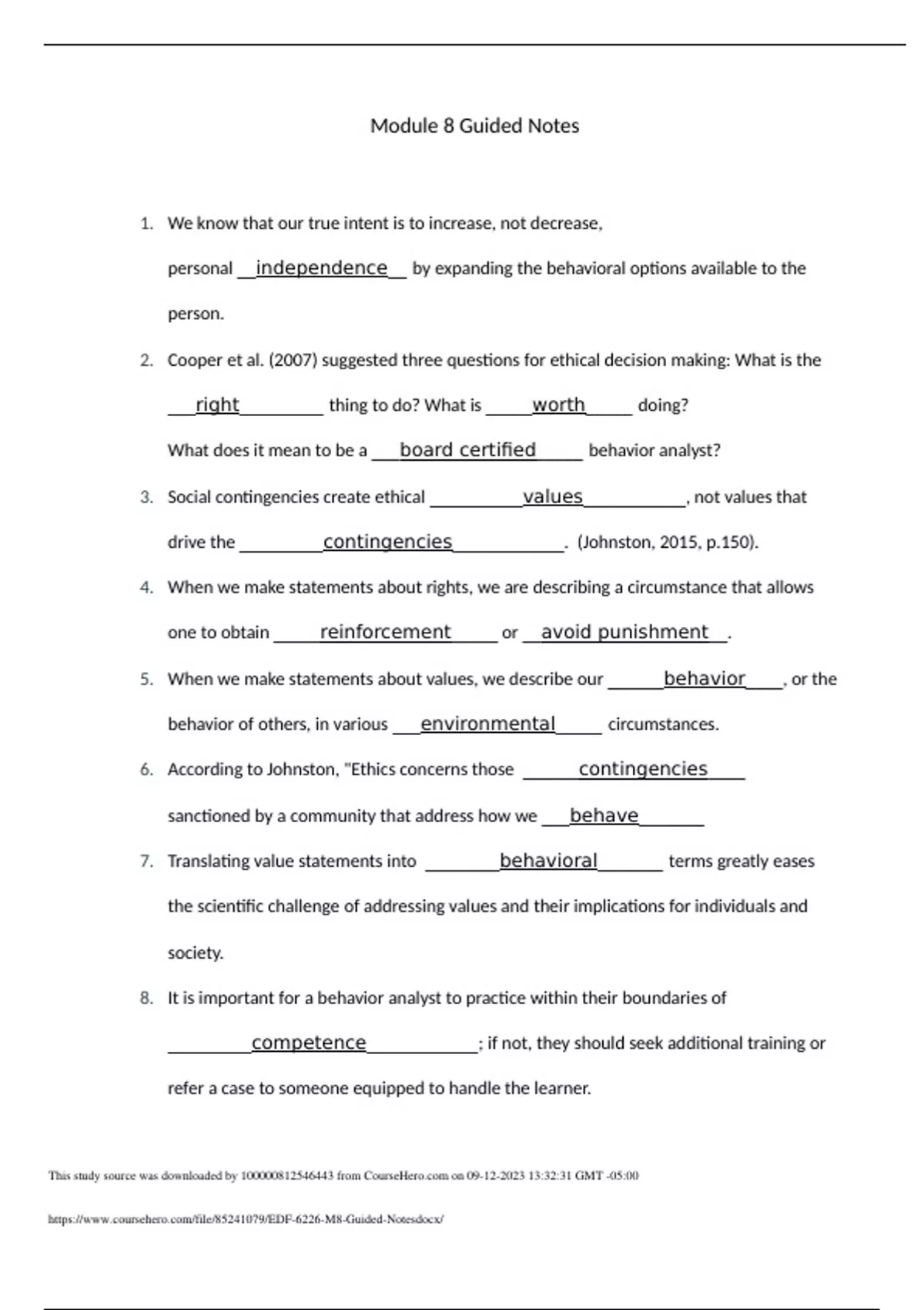 Module 8 Guided Notes 1. We know that our true intent is to increase, not decrease, personal __independence__ by expanding the behavioral options available to the person. 2. Cooper et al. (2007) suggested three questions for ethical decision making: What is the ___right_________ thing to do? What is _____worth_____ doing? What does it mean to be a ___b