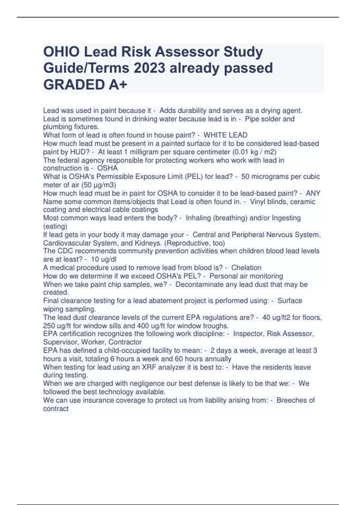 OHIO Lead Risk Assessor Study Guide/Terms 2023 already passed GRADED A+ Lead was used in paint because it - Adds durability and serves as a drying agent. Lead is sometimes found in drinking water because lead is in - Pipe solder and plumbing fixtures. What form of lead is often found in house paint? - WHITE LEAD How much lead must be present in a painted surface for it to be considered lead-based paint by HUD? - At least 1 milligram per square centimeter (0.01 kg / m2) The federal agency responsible for protecting workers who work with lead in construction is - OSHA What is OSHA's Permissible Exposure Limit (PEL) for lead? - 50 micrograms per cubic meter of air (50 µg/m3) How much lead must be in paint for OSHA to consider it to be lead-based paint? - ANY Name some common items/objects that Lead is often found in. - Vinyl blinds, ceramic coating and electrical cable coatings Most common ways lead enters the body? - Inhaling (breathing) and/or Ingesting (eating) If lead gets in your body it may damage your - Central and Peripheral Nervous System, Cardiovascular System, and Kidneys. (Reproductive, too) The CDC recommends community prevention activities when children blood lead levels are at least? - 10 ug/dl A medical procedure used to remove lead from blood is? - Chelation How do we determine if we exceed OSHA's PEL? - Personal air monitoring When we take paint chip samples, we? - Decontaminate any lead dust that may be created. Final clearance testing for a lead abatement project is performed using: - Surface wiping sampling. The lead dust clearance levels of the current EPA regulations are? - 40 ug/ft2 for floors, 250 ug/ft for window sills and 400 ug/ft for window troughs. EPA certification recognizes the following work discipline: - Inspector, Risk Assessor, Supervisor, Worker, Contractor EPA has defined a child-occupied facility to mean: - 2 days a week, average at least 3 hours a visit, totaling 6 hours a week and 60 hours annually When testing for lead using an XRF analyzer it is best to: - Have the residents leave during testing. When we are charged with negligence our best defense is likely to be that we: - We followed the best technology available. We can use insurance coverage to protect us from liability arising from: - Breeches of contract In addition to training to become an inspector, anyone using an XRF to test for lead based paint must: - Receive direct factory training by the manufacturer for the specific XRF being used. Under Title X federally owned or assisted houses are to: - Be evaluated for lead-based paint, lead hazards, and have leave hazards controlled. Under sections 1012 and 1013 of Title X, there are different standards for houses built prior to 1960 and those built between 1960 and 1978. But in all such houses we must: - Use safe work practices where work is performed. When collecting wipe samples it is advisable to place the sample in: - A polyethylene centrifuge tube. We use gloves in wipe tests to: - Protect the sample from lead on the inspector's hands. Lead dust in a home may be the result of: - Deteriorated paint, remodeling, tracking in of dirt. HUD is most concerned with lead in soil: - Where children play in bare soil. What law governs training of lead workers in HUD houses? - EPA Toxic Substance Control Act. A lead-based paint inspection is best described as: - A surface-by-surface investigation to determine the presence of lead-based paint. Title X of the 1992 Housing and Community Development Act requires that federally owned or assisted housing be: - Inspected for lead-based paint, assessed for risks posed by lead present, provided control measures for lead hazards found. The following is not a method of abatement for lead-based paint: - Coating with latex paint. When using an XRF analyzer what device should an inspector use to monitor radiation? - Dosimeter EPA recommends that we use XRF instruments for which HUD and EPA have developed: - Performance characteristics sheet When surfaces do not allow for use of an XRF, we should take paint chips and send them to labs accredited by: - The National Lead Laboratory Accreditation Program (NLLAP) The degree of agreement o